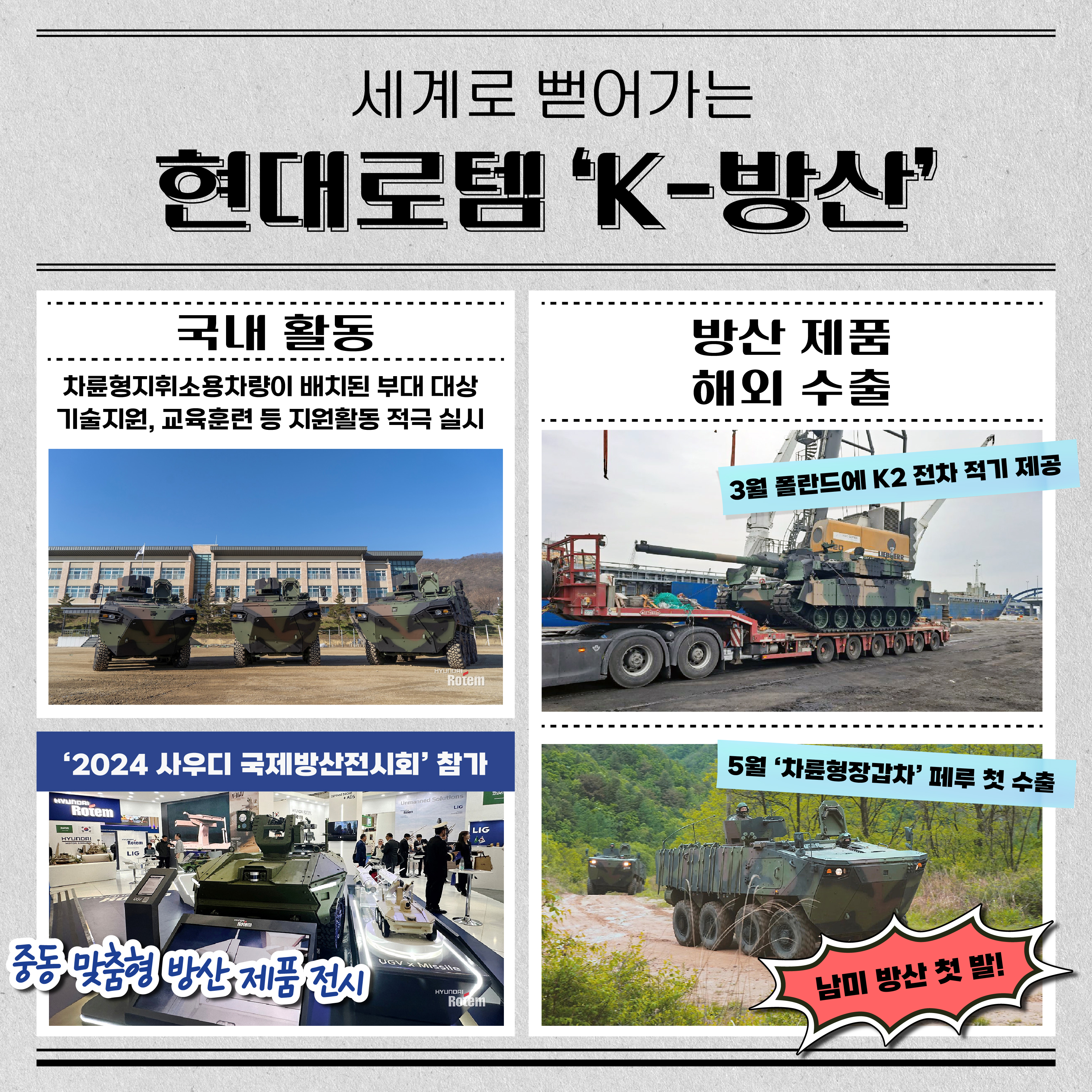현대자동차그룹과 협업해 개발한 ‘4세대 HR-셰르파’도 6월에 최초 공개해 무인 차량 기술력을 더욱 고도화했는데요. 이달 4일에는 폴란드가 주최한 ‘제32회 폴란드 국제 방산 전시회(MSPO)’ 에 참여해 실물 K2전차와 다목적 무인차량 등 전차 라인업을 다채롭게 공개했어요. 차세대 플랫폼 라인업으로 뛰어난 기술력의 혁신성을 인정받기도 했죠.