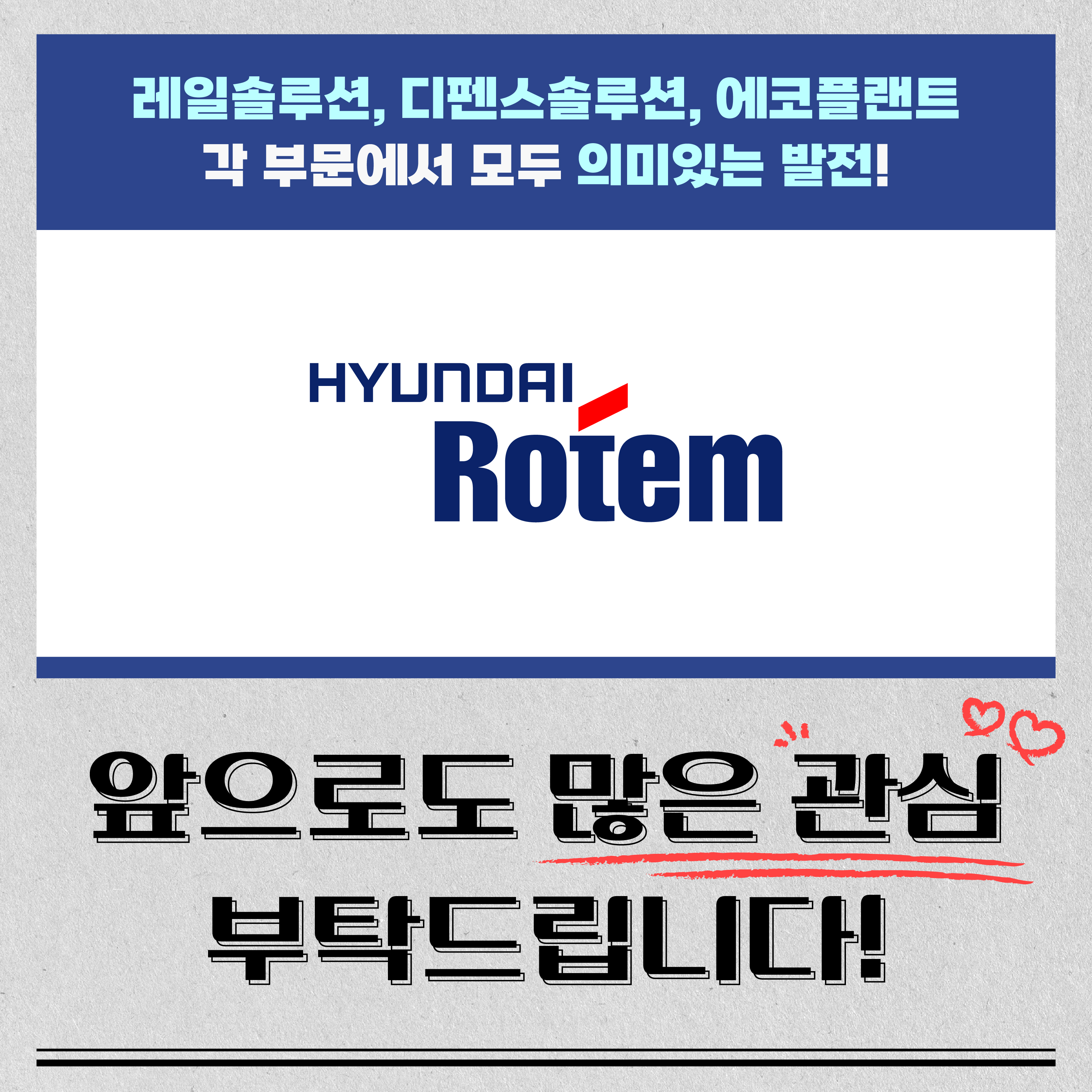 2024년 현재까지 현대로템은 레일솔루션, 디펜스솔루션 등 각 부문에서 모두 의미 있는 발전을 이뤄냈는데요. 2025년까지 앞으로 100일 남은 지금에도 힘차게 전진하고 있는 현대로템의 행보에 많은 관심과 응원 부탁드려요! 모두 파이팅!