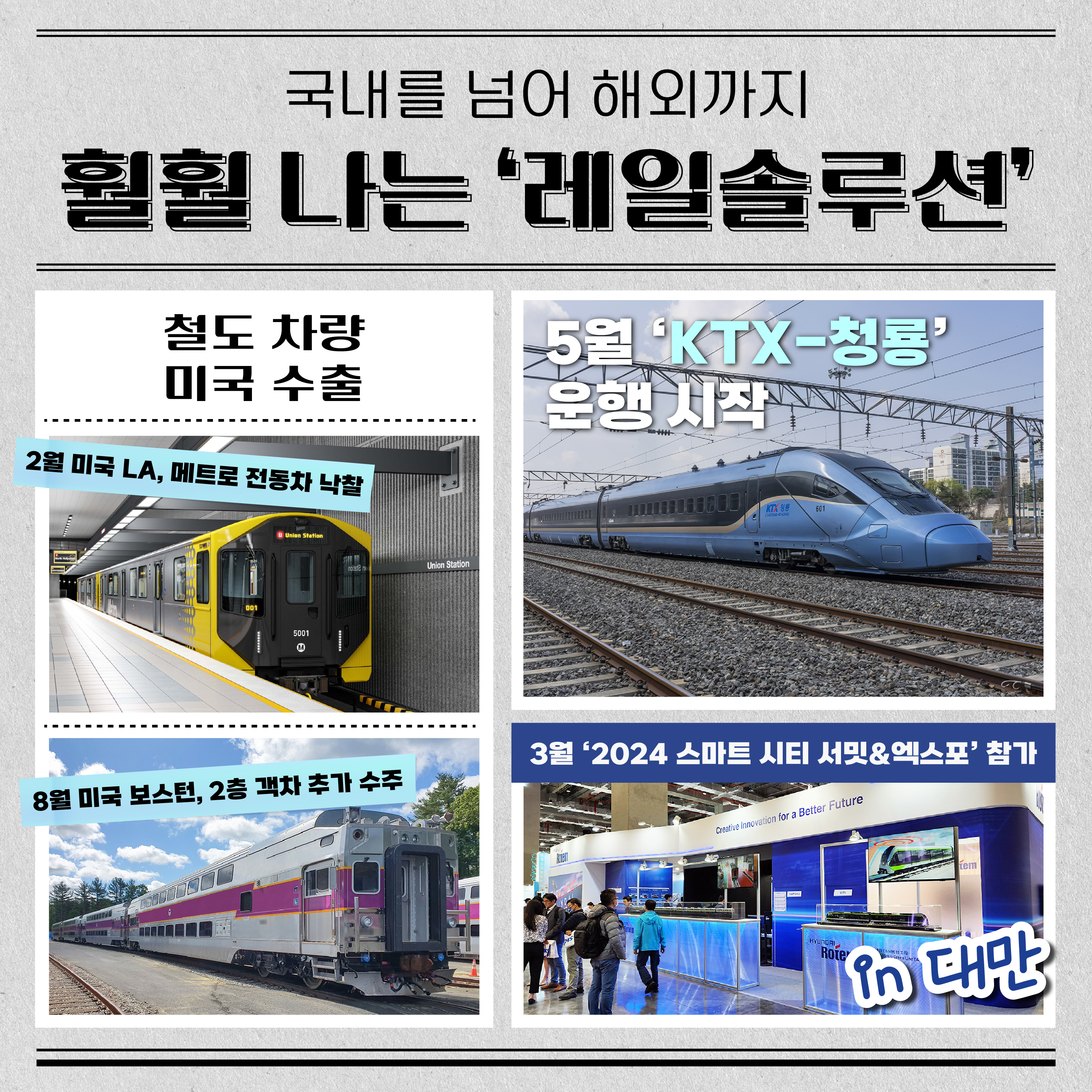 또 지난 3월 대만에서 열린 ‘2024 스마트 시티 서밋 & 엑스포’에서는 도시철도와 독보적인 미래 수소 에너지 사업 역량을 함께 선보여 업계 관계자들의 많은 이목을 받았는데요. 4월에는 우리나라에서 가장 빠른 고속열차 ‘KTX-청룡’이 집중점검 실시 후 익월부터 경부선과 호남선을 힘차게 달리는 기쁜 소식도 있었어요.