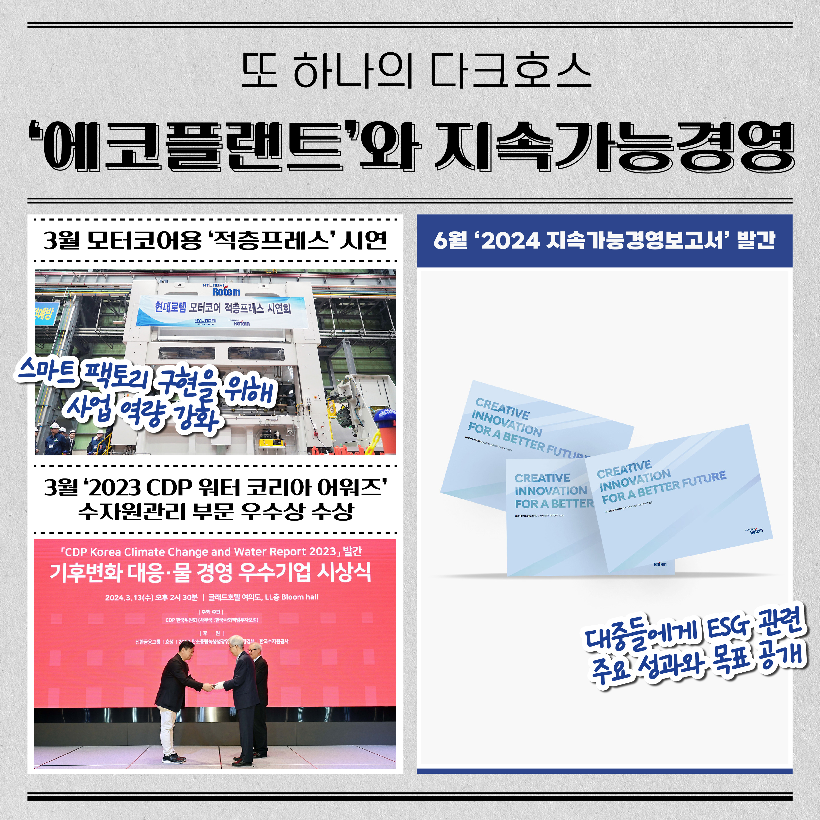 이 밖에도 현대로템은 지속가능경영을 위해 다방면으로 힘쓰고 있습니다. 그에 대한 결실로 3월에는 ‘2023 CDP(탄소정보공개프로젝트) 워터 코리아 어워즈’에서 수자원관리 부문에서 우수상(리더십A-등급)을 받아 지속가능경영에 대한 노력을 인정받았습니다. 또 6월에 발간한 ‘2024 지속가능경영보고서’를 통해 대중들에게 ESG 관련 주요 성과와 목표를 드러내기도 했어요.