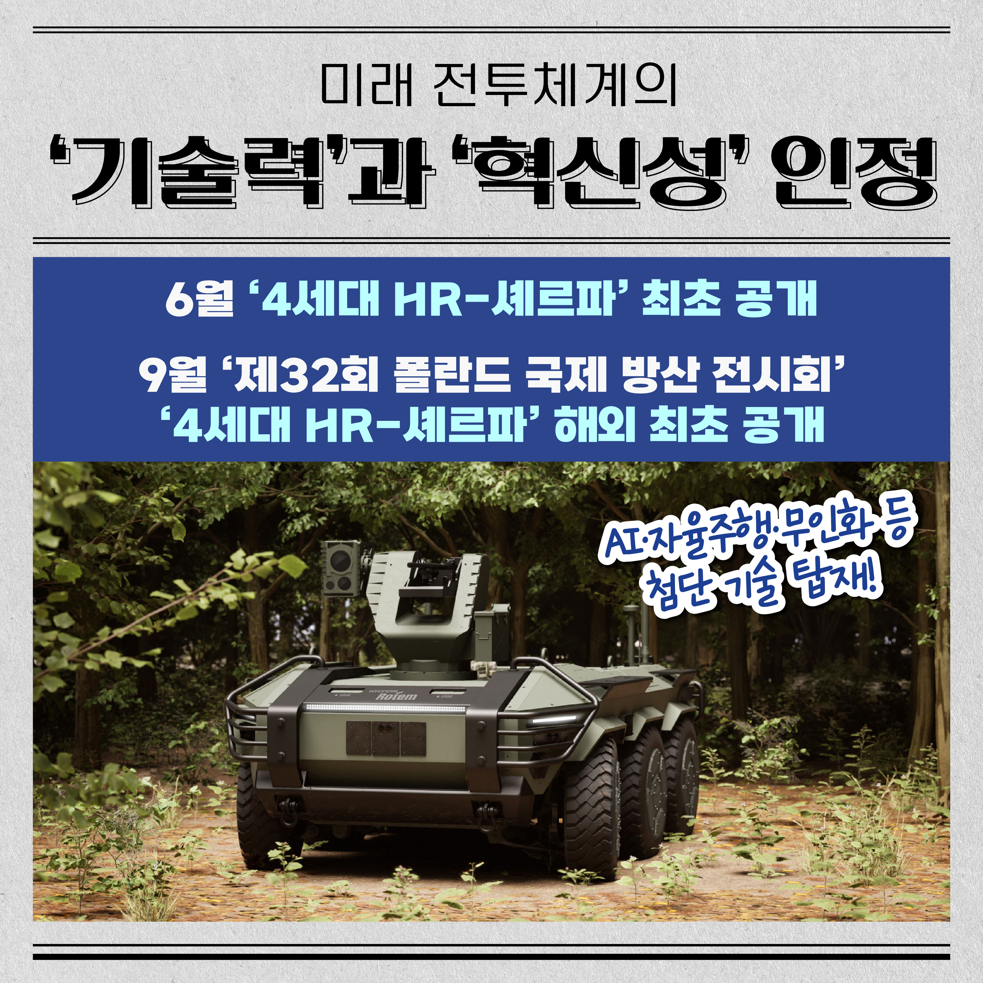 현대자동차그룹과 협업해 개발한 ‘4세대 HR-셰르파’도 6월에 최초 공개해 무인 차량 기술력을 더욱 고도화했는데요. 이달 4일에는 폴란드가 주최한 ‘제32회 폴란드 국제 방산 전시회(MSPO)’ 에 참여해 실물 K2전차와 다목적 무인차량 등 전차 라인업을 다채롭게 공개했어요. 차세대 플랫폼 라인업으로 뛰어난 기술력의 혁신성을 인정받기도 했죠.