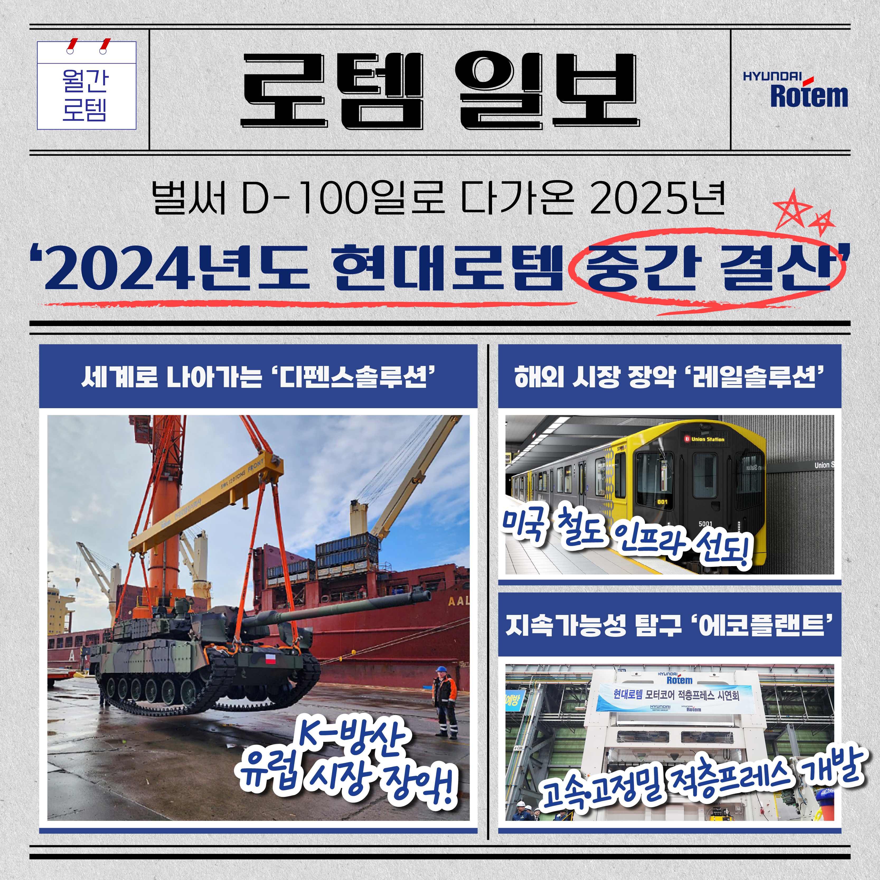2024년 현재까지 현대로템은 레일솔루션, 디펜스솔루션 등 각 부문에서 모두 의미 있는 발전을 이뤄냈는데요. 2025년까지 앞으로 100일 남은 지금에도 힘차게 전진하고 있는 현대로템의 행보에 많은 관심과 응원 부탁드려요! 모두 파이팅!