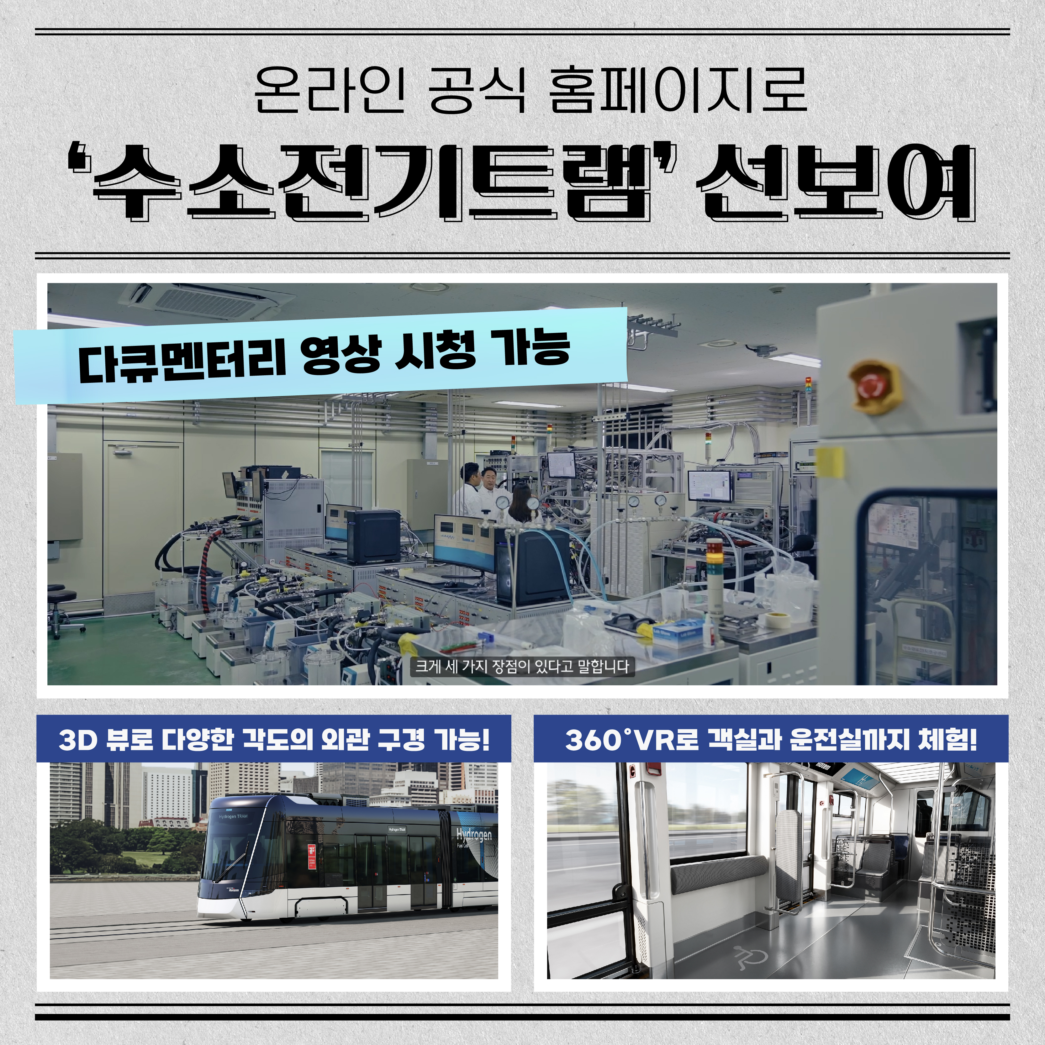 아울러 지난 9일에는 차세대 교통수단으로 각광받는 ‘수소전기트램’ 공식 홈페이지를 오픈해 많은 ‘철덕’들을 설레게 했는데요. 그 중에서도 다큐멘터리 영상과 360도 VR영상으로 많은 사람들이 트램을 더 생생하게 체험할 수 있도록 했어요. 수소전기트램을 만나보고 싶다면, 지금 바로 아래 홈페이지에서 확인해 보세요!