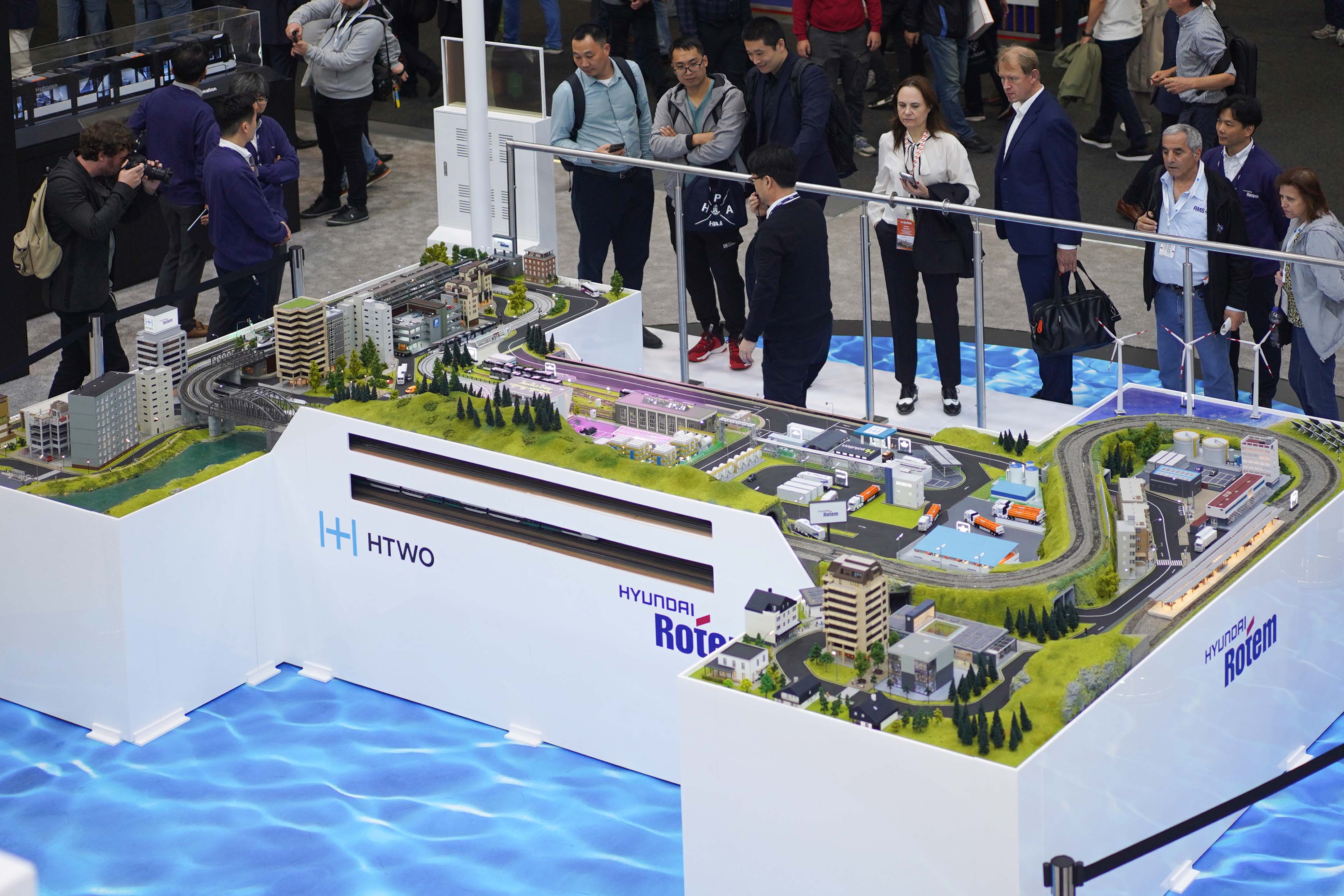 우선 현대로템은 다가올 수소 사회를 구현한 디오라마를 선보입니다. 디오라마는 도시 경관과 자연 등을 축소해 옮겨놓은 모형입니다. 수소전기트램, 수소전기동력차 등의 모빌리티가 도심을 누비고 한편에서는 수소 추출기, 수소 충전소 등 현대로템의 설비를 통해 수소의 생산과 저장, 운송이 이뤄지는 모습을 구현했습니다.
