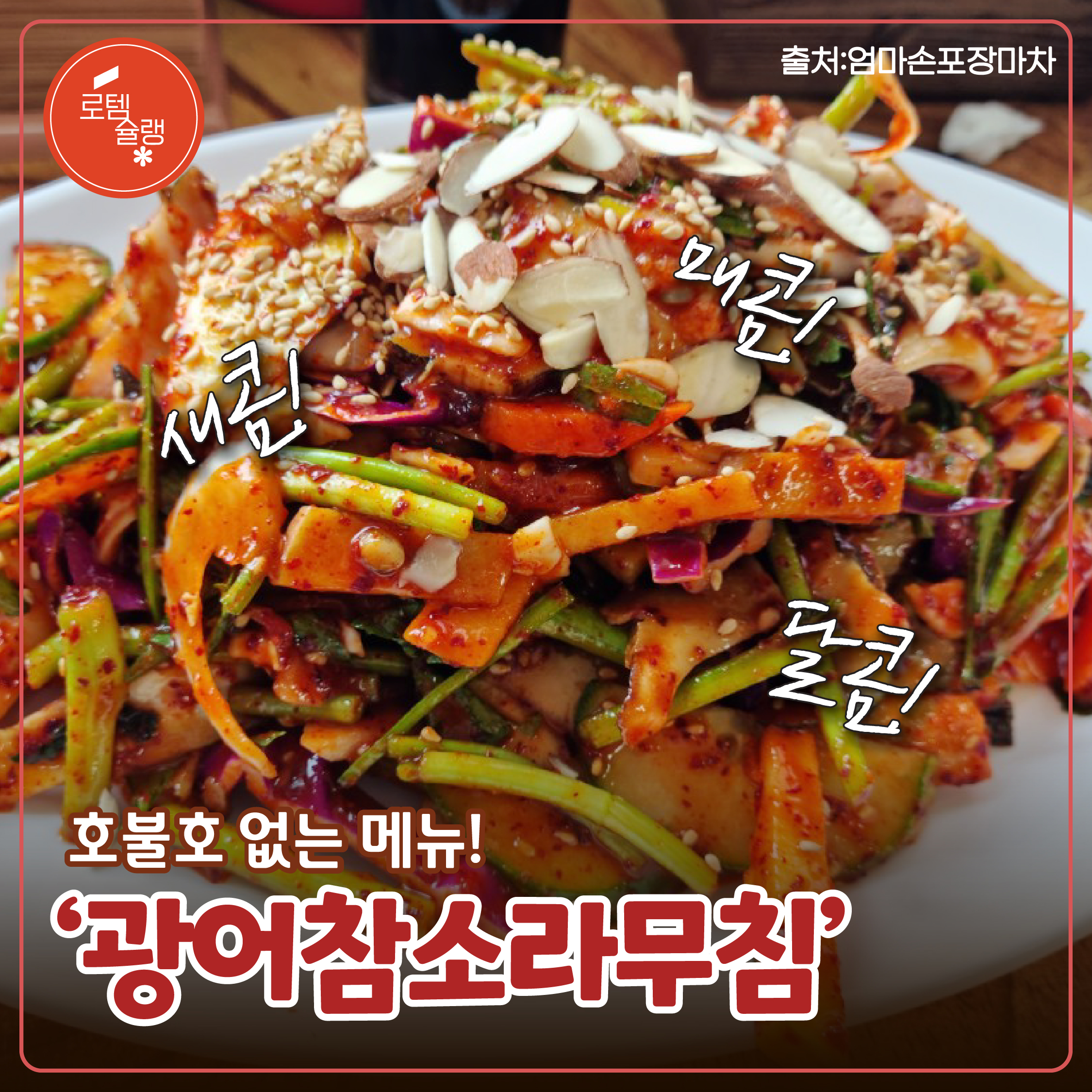 해물칼국수에 광어, 참소라 무침도 함께 곁들이면 이만한 천생연분, 찰떡궁합이 없다는 생각이 드는데요. 푸짐한 양은 물론이고 신선한 광어와 소라가 맛있게 무쳐 나와 정말 맛있었어요. 무침은 양념맛이 중요한데 이곳의 양념은 적당히 새콤, 달콤, 매콤해 우리나라 사람이라면 누구나 호불호 없이 좋아할 메뉴랍니다