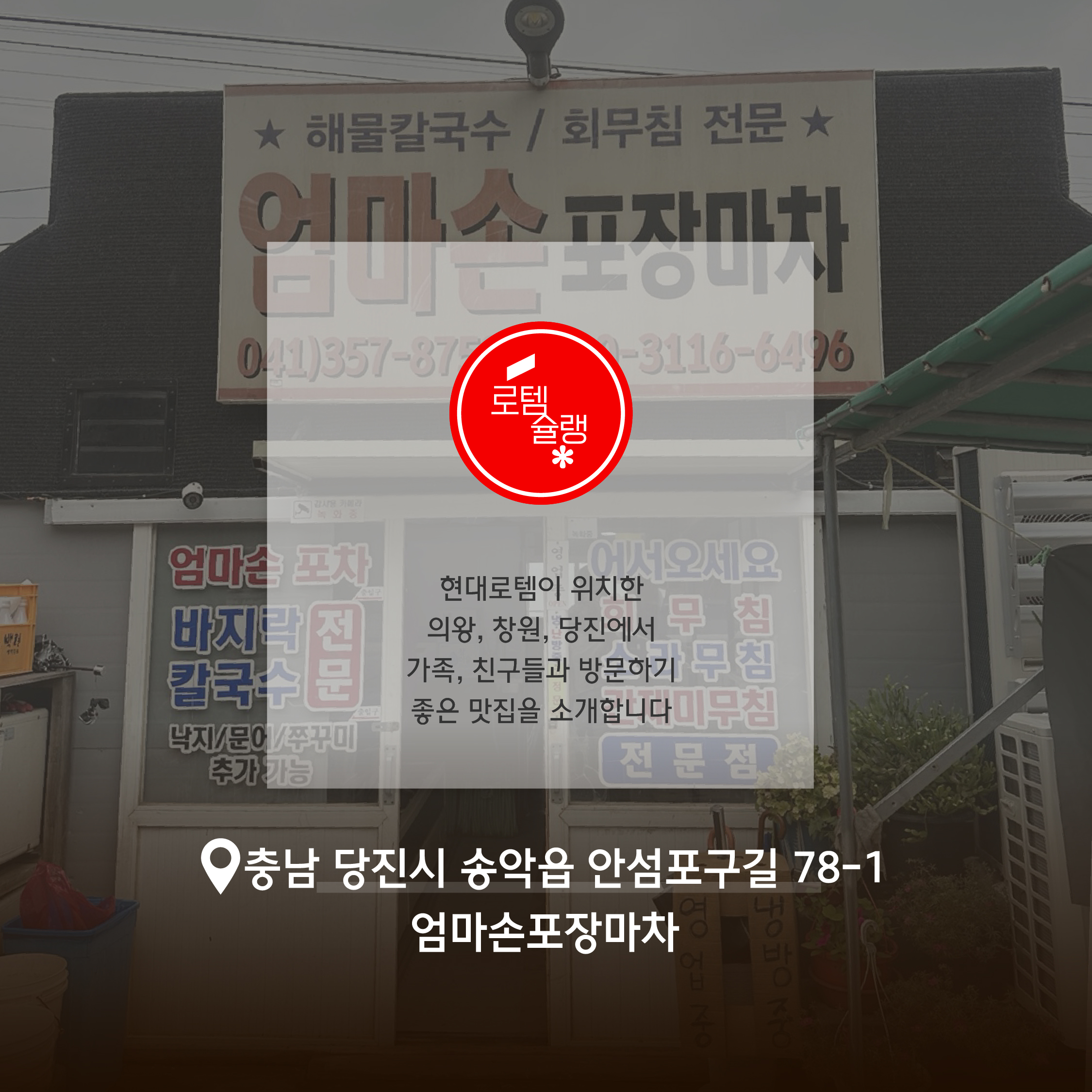 어느덧 가을이 성큼 찾아왔는데요. 뜨거운 국물이 생각나면서 가을철 요리의 주재료인 서해안 해산물들도 생각이 납니다. 이번 달에는 특별히 현대로템 당진공장 임직원들이 강력 추천하는 맛집으로 가봤습니다. 서해의 제철 해산물이 한가득 들어가 몸보신 제대로 하고 집 나간 입맛도 되찾아주는 해물칼국수 맛집 ‘엄마손포장마차’입니다.