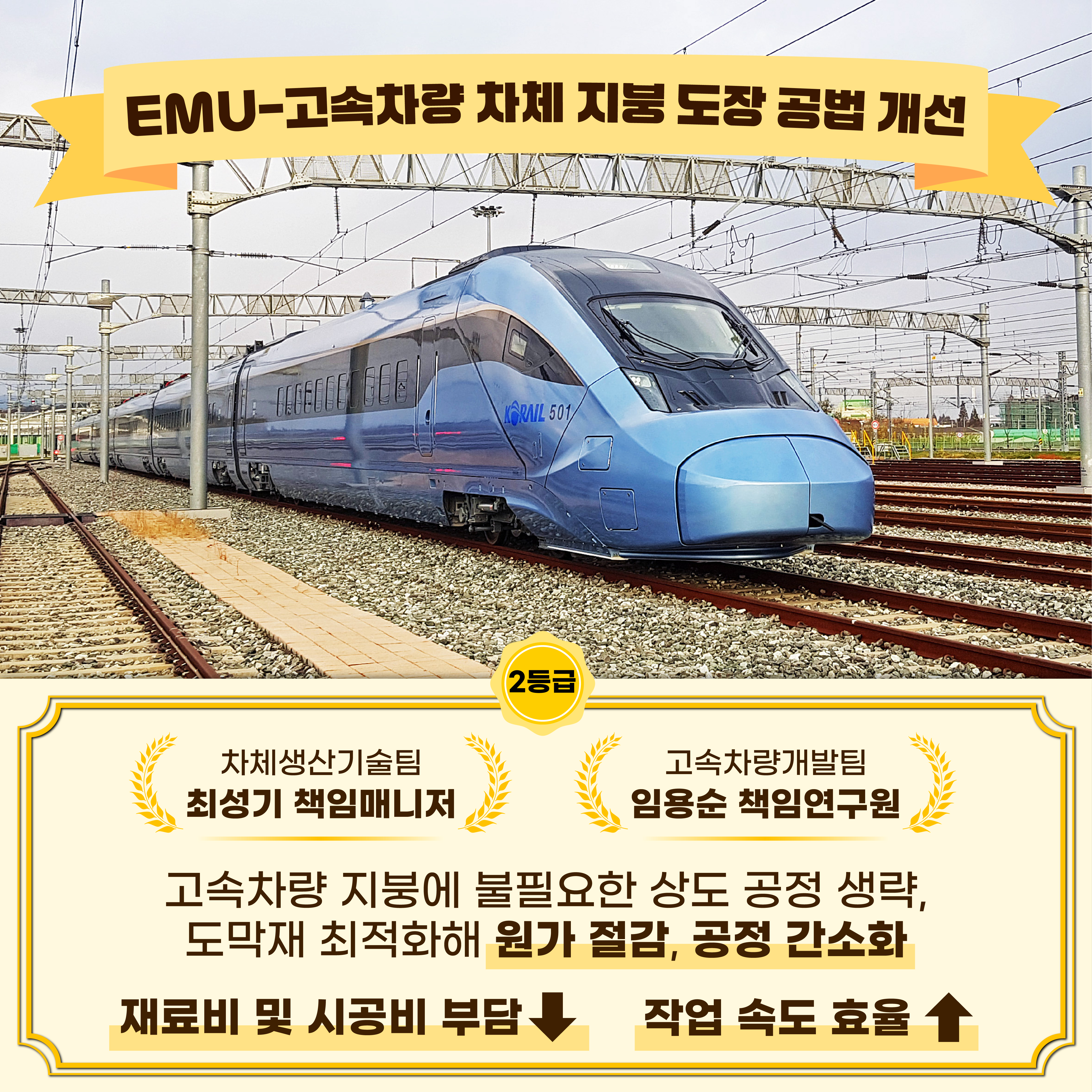 먼저 유일하게 원가혁신 2등급을 받은 아이디어를 소개합니다. 바로 레일솔루션(RS) 차체생산기술팀 최성기 책임매니저와 고속차량개발팀 임용순 책임연구원이 공동 제안한 ‘EMU-고속차량 차체 지붕 도장 공법 개선’인데요.