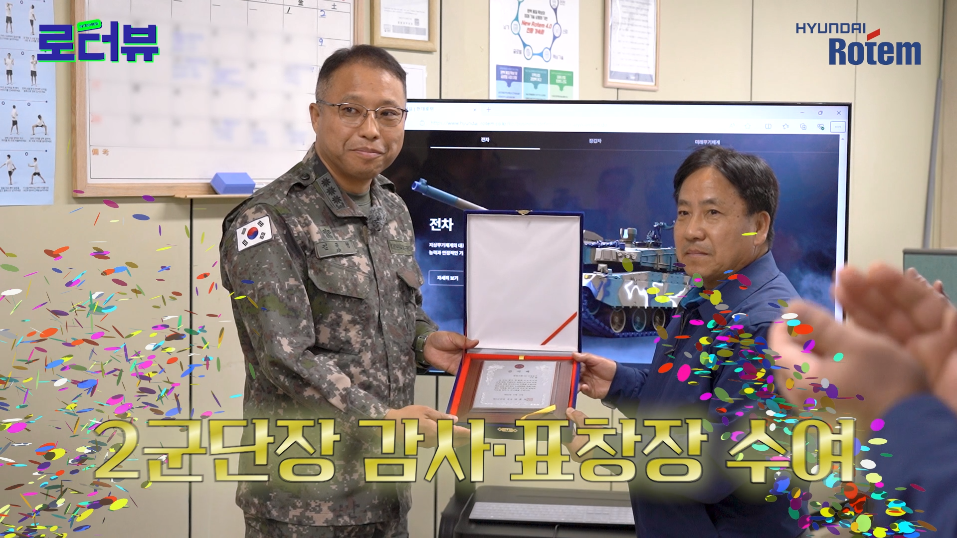 김권형 대령: 안녕하세요. 저는 2군단 군수처장 김권형 대령입니다. 2군단장님이신 박후성 장군을 대신해서 현대로템 방산CS팀 춘천기지에 감사장을 수여할 수 있는 기회를 주셔서 감사드립니다. 강원도가 상당히 열악한 지역이다 보니 저희 군인들도 기피하는 곳 중 하나인데요.