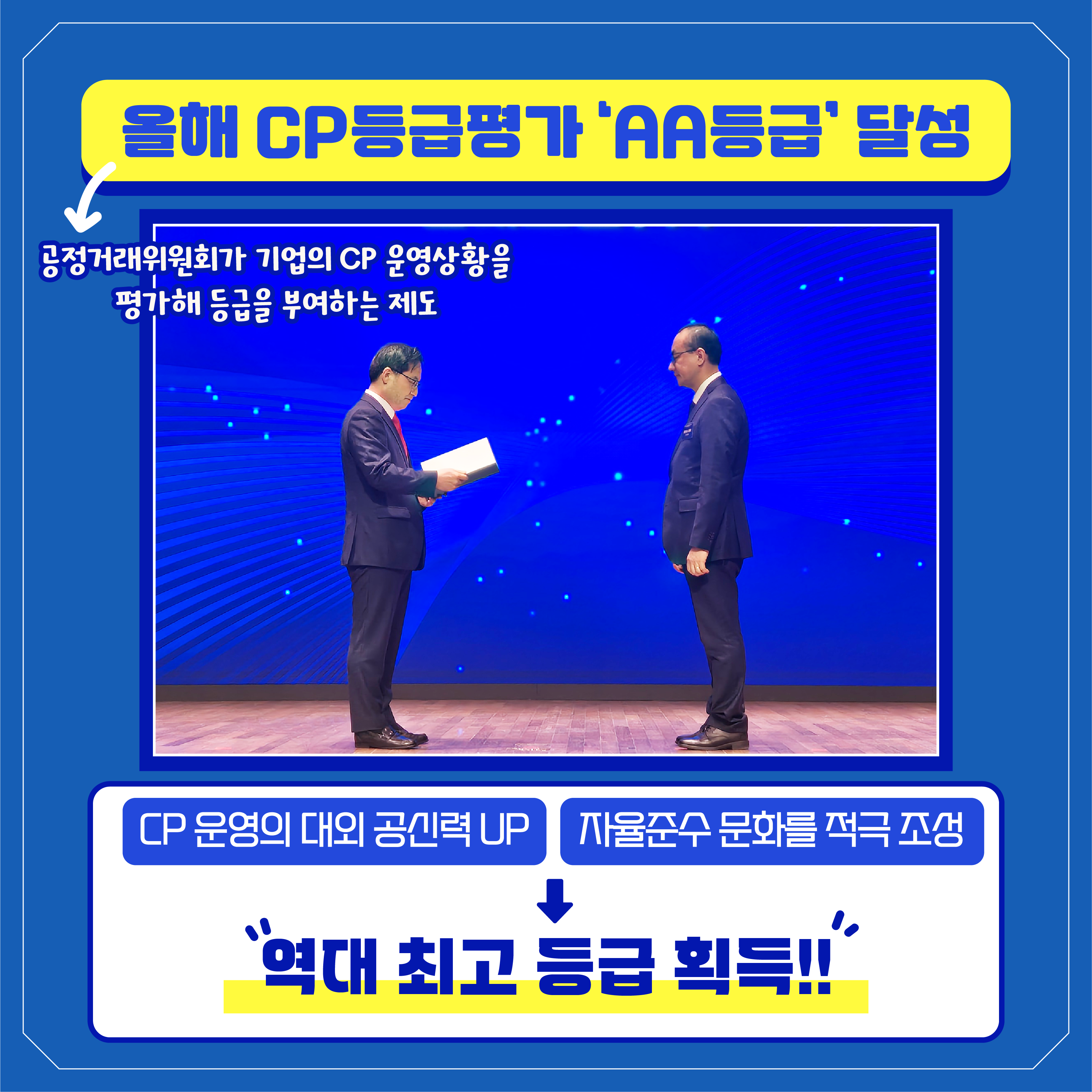 그 일환으로 올해 CP 등급평가에 참여했는데요. CP 운영의 대외 공신력을 높이고 자율준수 문화를 적극 조성한 결과, 이번 평가에서 가장 높은 점수인 ‘AA 등급’을 받았어요! CP 등급평가는 공정거래위원회가 기업의 CP 운영상황을 평가해 등급을 부여하는 제도예요.
