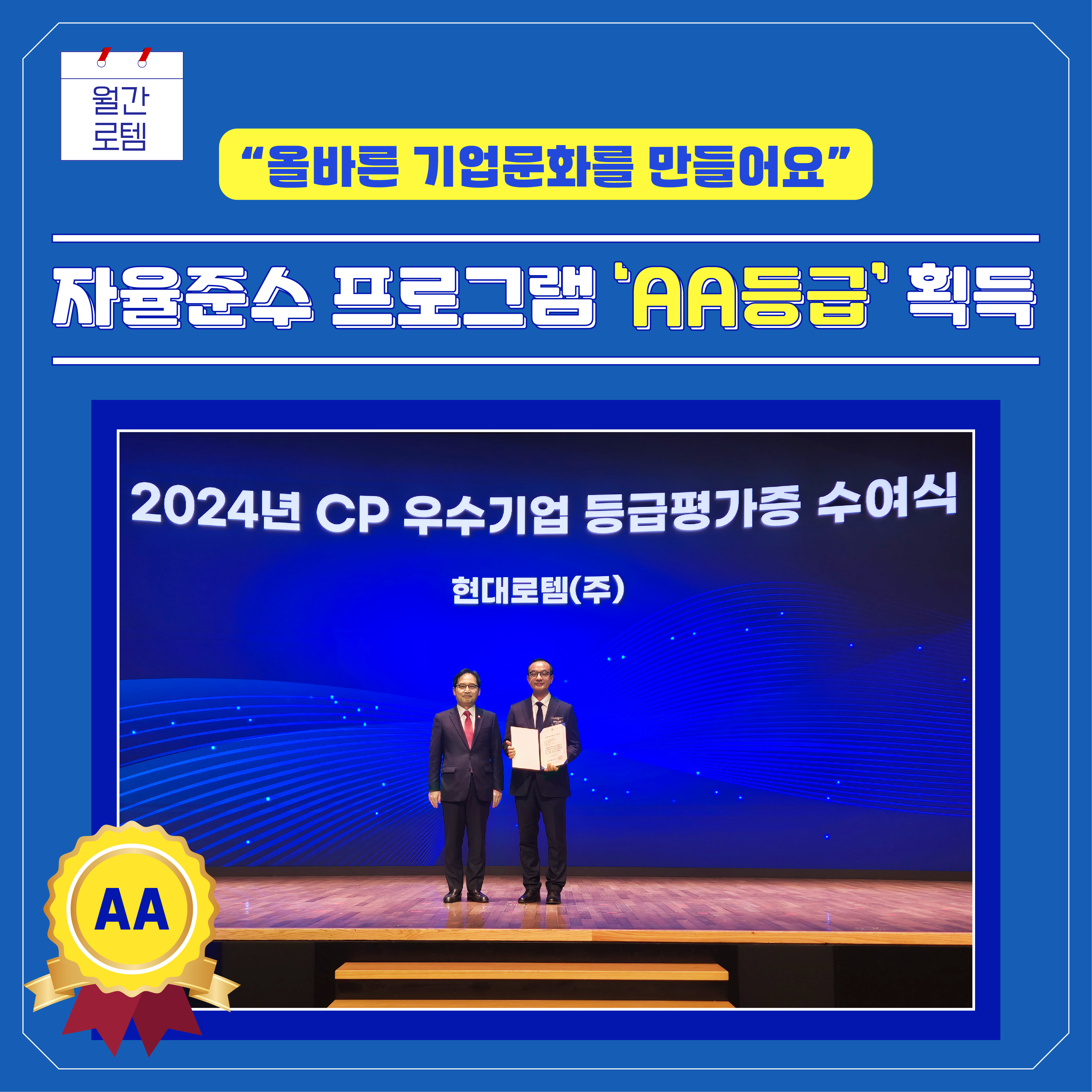 현대로템은 공정거래 법규를 준수하고 공정거래 자율준수 문화를 실현하기 위해 다양한 공정거래 자율준수 프로그램(CP: Compliance Program) 활동을 진행하고 있습니다. 특히 올해는 공정거래위원회에서 CP 운영의 우수성을 인정받아 ‘AA등급’을 받았는데요. 현대로템의 2024년도 주요 CP 활동과 성과, 더 자세히 알아보시죠!