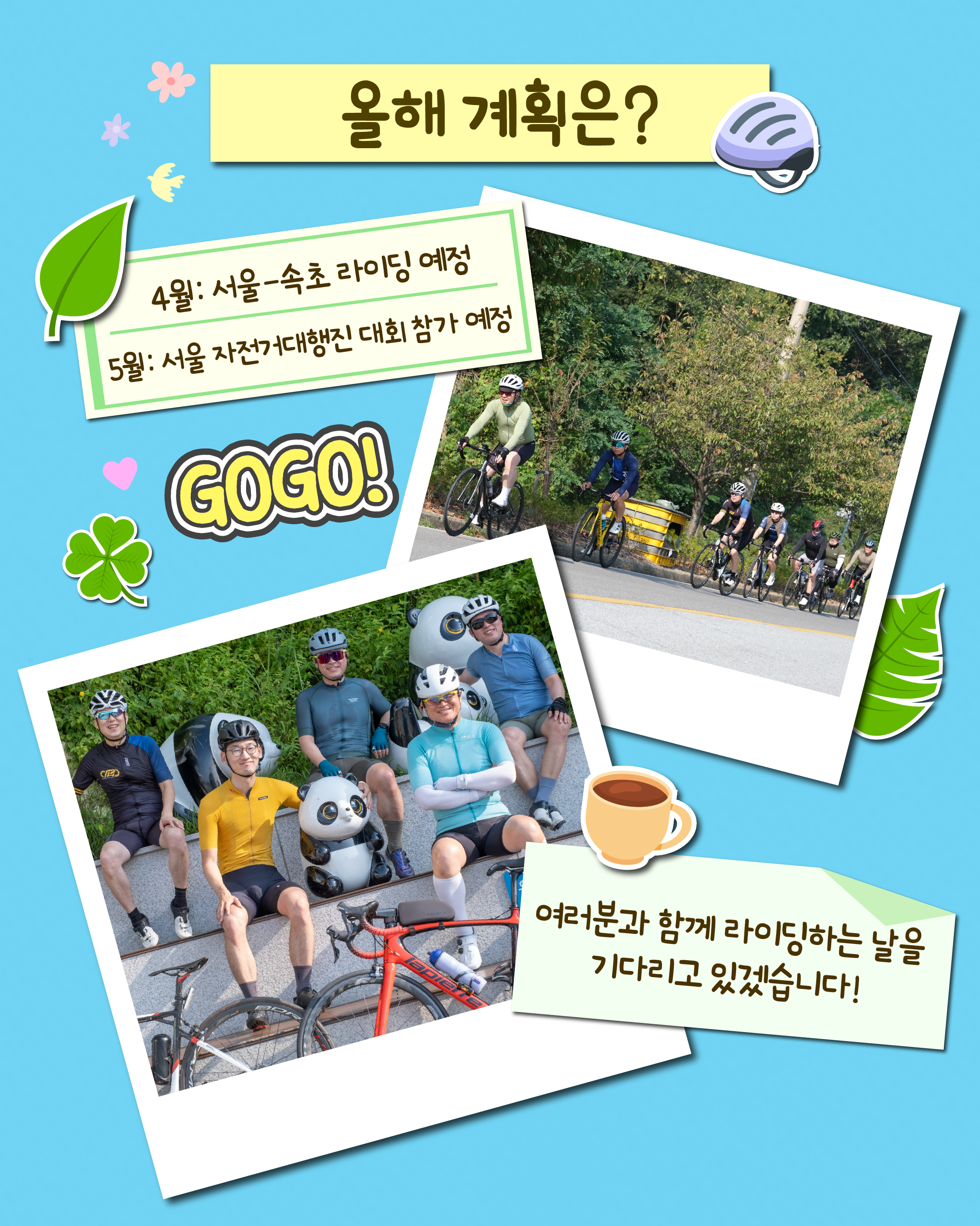 권용범 매니저: 올해도 열정 가득한 한 해를 준비하고 있습니다! 상반기에는 4월에 서울-속초 라이딩을 계획하고 있는데요. 길고 아름다운 여정을 완주하며 함께 성취감을 느낄 수 있는 특별한 경험이 될 것입니다.