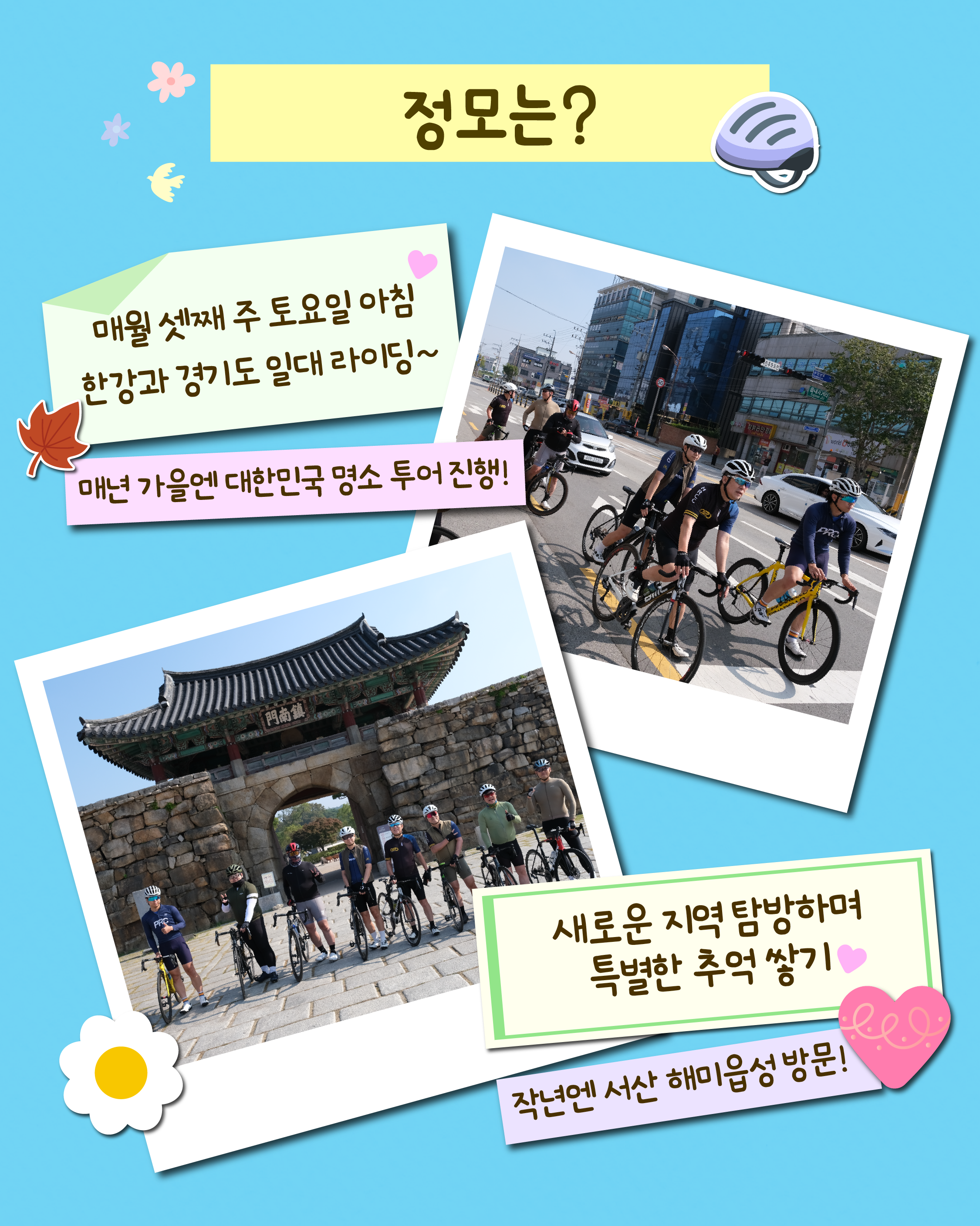 권용범 매니저: 네, 맞습니다. 매년 가을마다 버스를 대절해 전국의 자전거 라이딩 명소를 찾아 투어를 진행하고 있어요. 작년에는 서산 해미읍성을 방문해 역사적인 공간을 둘러보고 드넓게 펼쳐진 아름다운 한우목장의 풍경도 감상하며 자연의 정취를 만끽하는 시간을 가졌습니다.