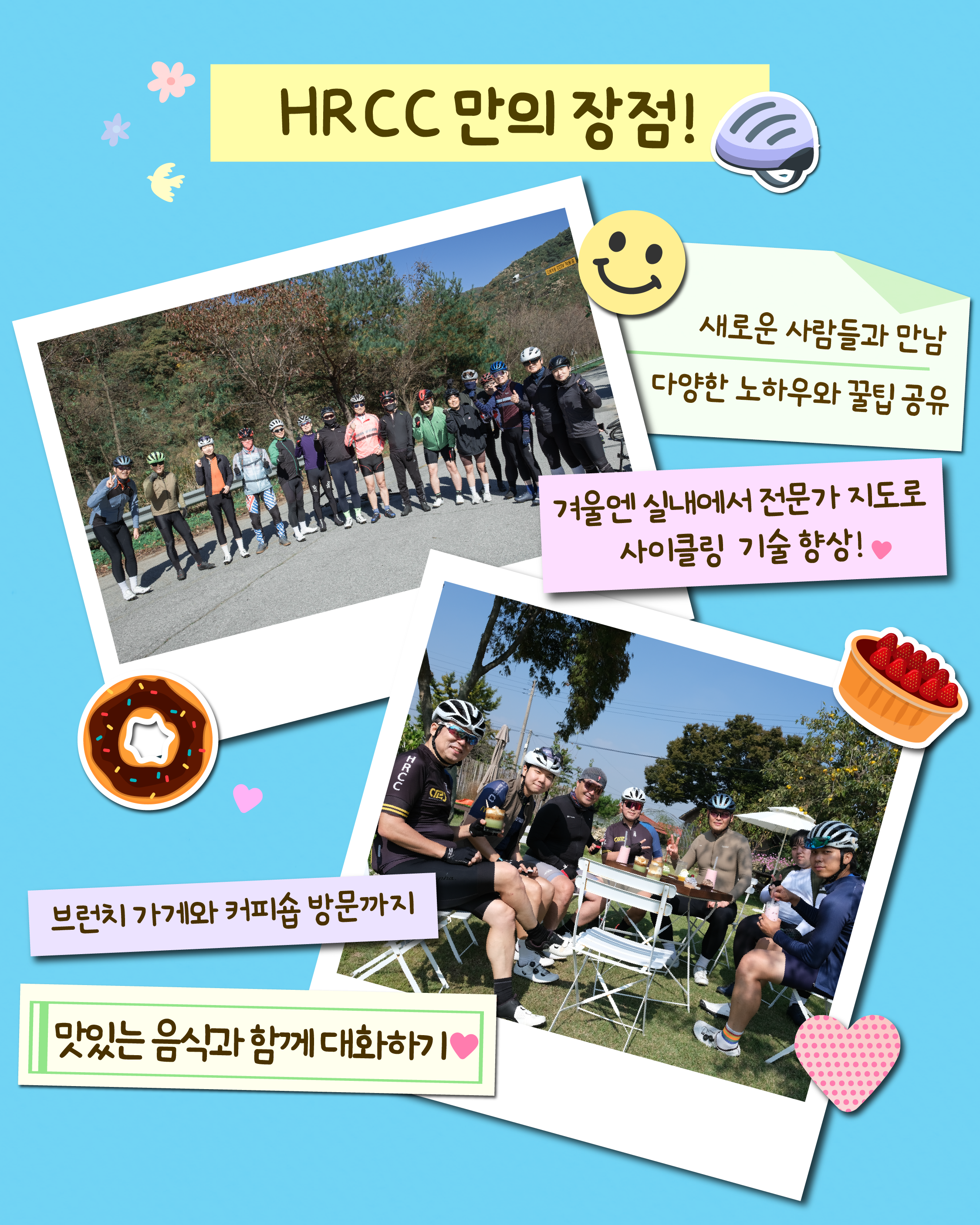 또 실내에서 진행하는 자전거 교육도 굉장히 도움이 되었어요. 체계적으로 배우면서 자신감도 붙고 실력도 조금씩 늘어나는 게 느껴지더라고요. 덕분에 HRCC에 가입한 건 정말 잘한 선택이었다고 생각합니다.