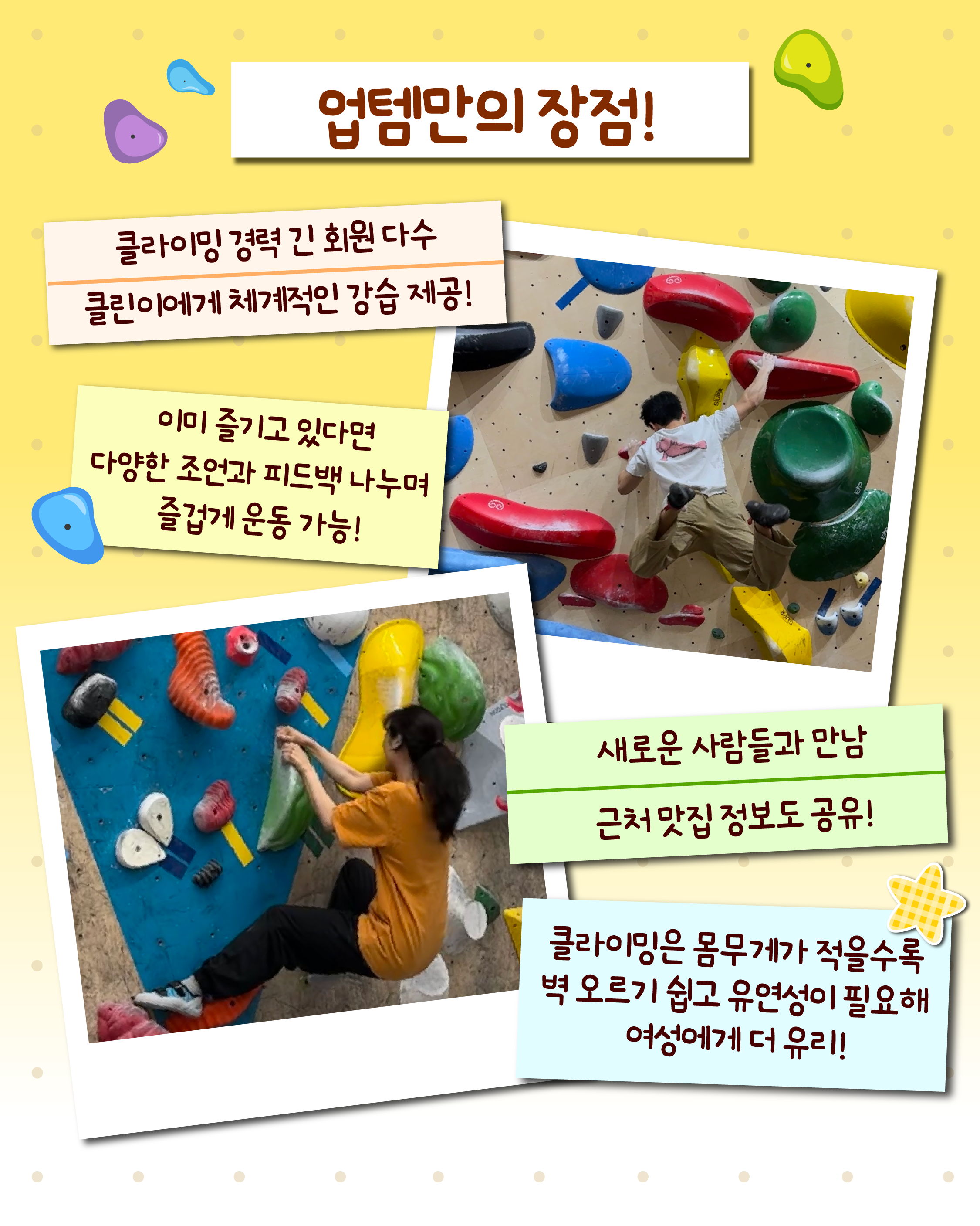 또한 업템에서 처음 클라이밍을 접하시는 분들을 위해 기초 자세 등을 친절하게 알려드리고 있으니 클린이 분들도 부담없이 클라이밍을 즐길 수 있습니다.