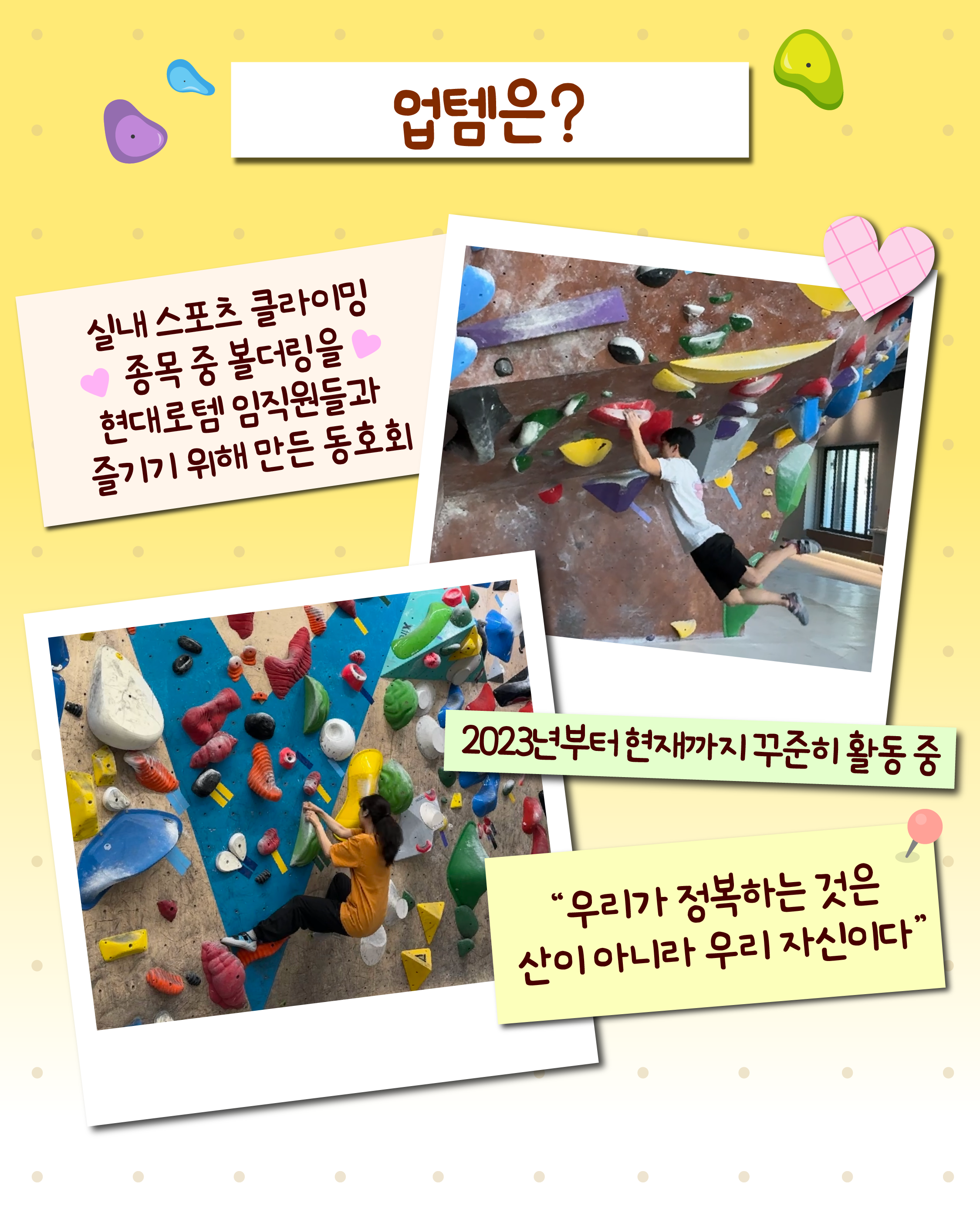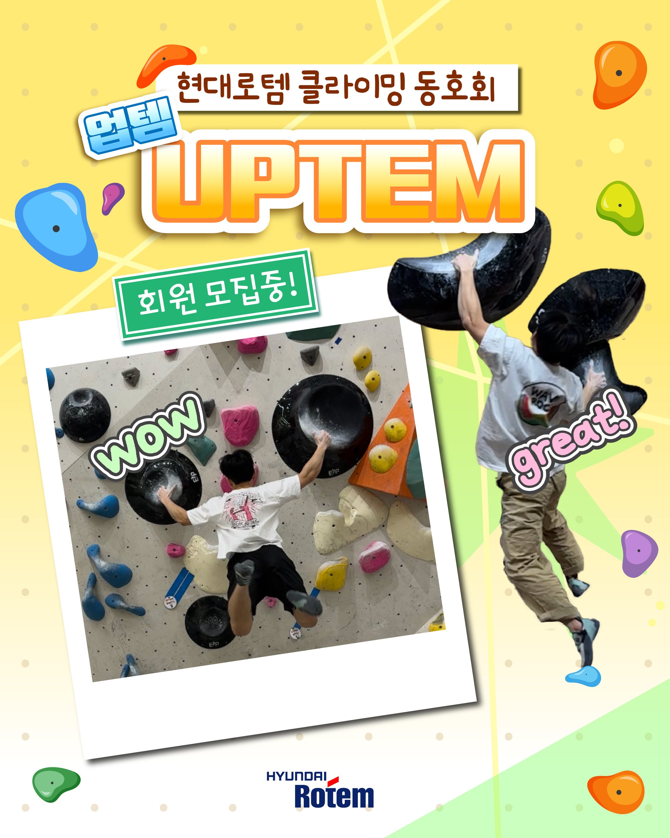 업템은 실내 스포츠 클라이밍 종목 중 볼더링을 현대로템 임직원들과 함께 즐기기 위해 만든 동호회입니다. 2023년부터 현재까지 회원들과 꾸준히 활동을 이어오며 친목을 유지하고 있습니다.