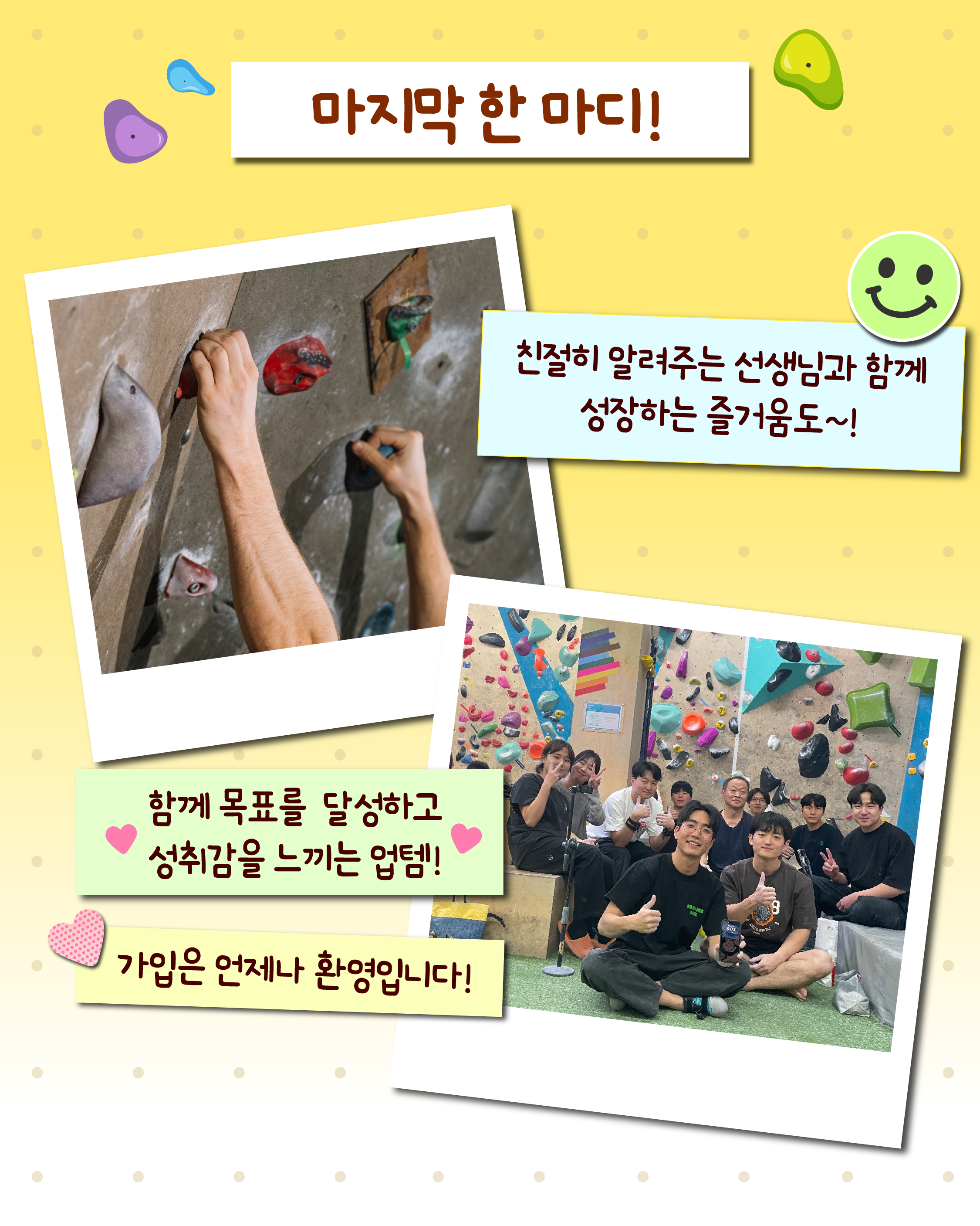 함께 목표를 달성하고 성취감을 느끼는 클라이밍 동호회, 업템이 궁금하신가요? 언제든지 연락주세요! 가입은 언제나 환영입니다.😊