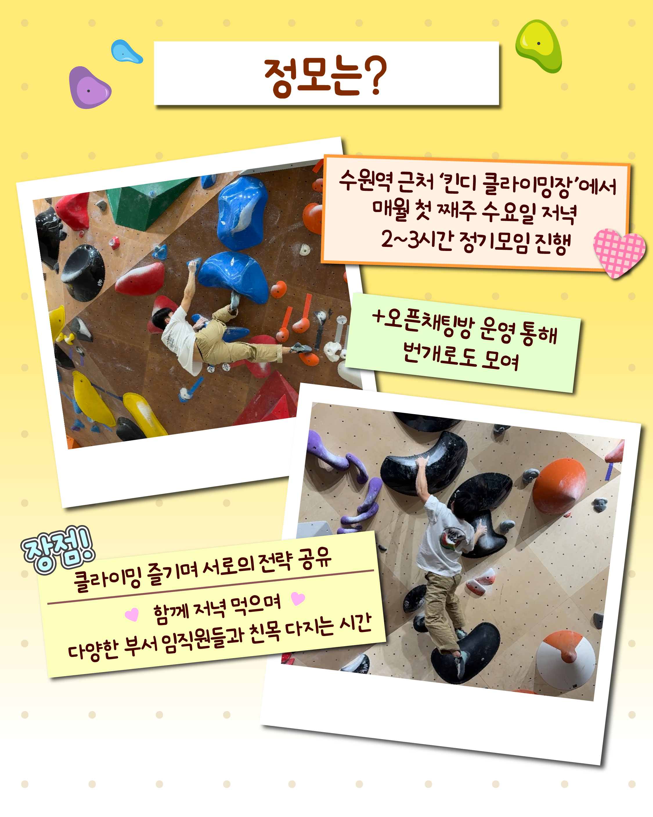 최재완 연구원: 업템은 의왕 임직원분들이 함께하고 있습니다. 저희는 주로 수원역근처 ‘킨디 클라이밍장’에서 매월 첫 째주 수요일 저녁에 2~3시간 정도 정기모임을 가지고 있습니다. 오픈채팅방 운영을 통해 번개로 모임을 가지기도 합니다.