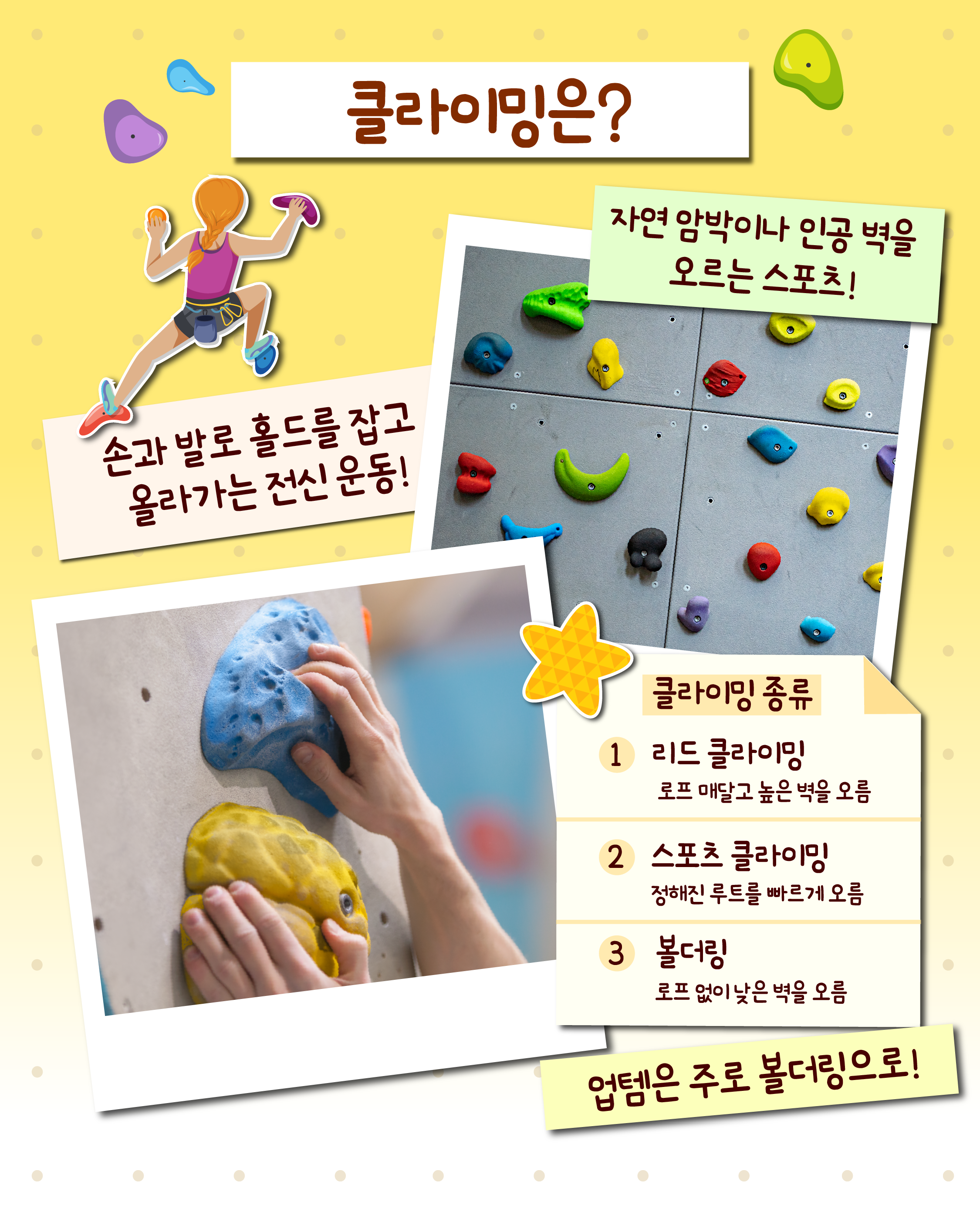 최재완 연구원: 클라이밍은 자연 암벽이나 인공 벽을 오르는 스포츠인데요. 손과 발로 홀드를 잡고 올라가면서 신체의 균형과 유연성, 근력을 모두 활용하는 전신 운동입니다.