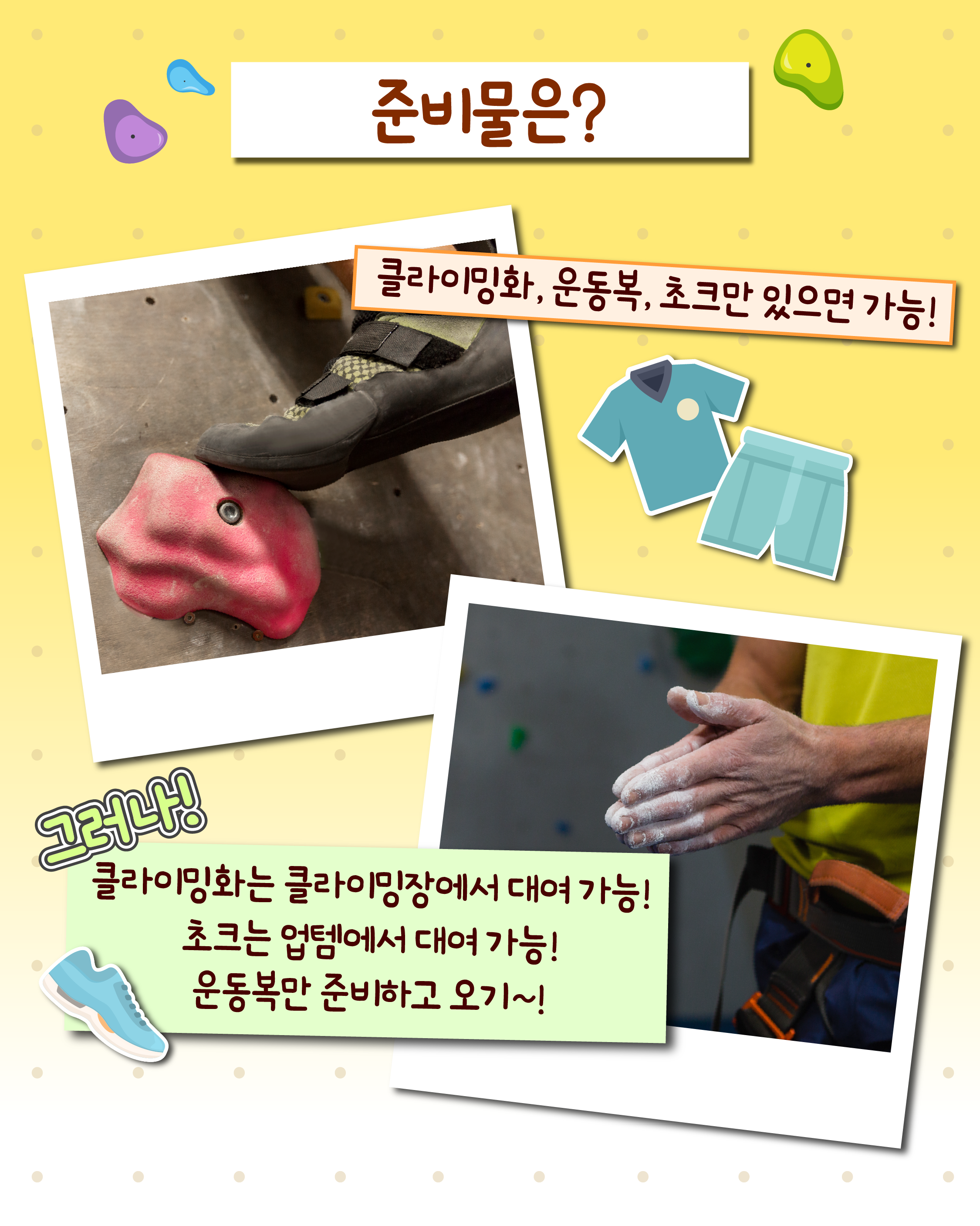 최재완 연구원: 기본적으로 클라이밍화, 신축성 좋은 편한 운동복(반팔, 긴바지), 초크만 있으면 클라이밍을 즐길 수 있습니다. 클라이밍화는 클라이밍장에서 대여할 수 있고, 초크는 동호회에서 빌려드리기 때문에 운동복만 준비하시면 됩니다.