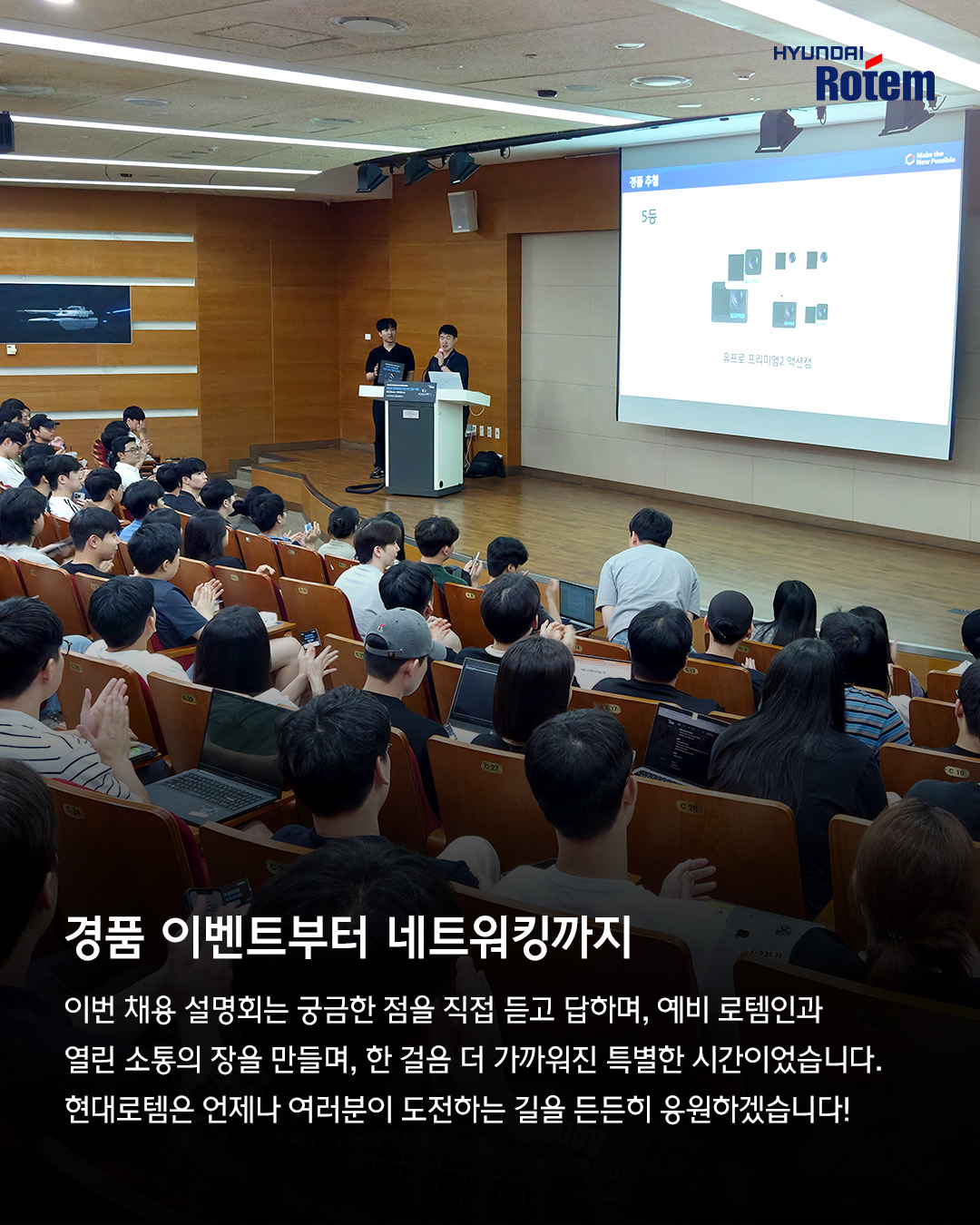 현장 분위기도 무척 활기찼습니다. 경품 이벤트와 네트워킹이 더해지면서 예비 지원자와 현대로템이 한층 더 가까워지는 자리가 되었죠. 단순히 듣기만 하는 설명회가 아니라, 함께 묻고 답하며 현대로템을 깊이 이해할 수 있는 기회였습니다.