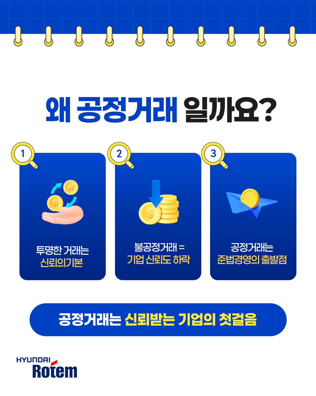 ‘공정거래’라고 하면 다소 딱딱하고 어려운 제도로만 느껴질 수 있습니다. 하지만 현대로템이 전하고 싶은 이야기는 단순합니다. 법과 규정을 지키는 차원을 넘어, 우리가 맺는 모든 관계 속에서 어떻게 신뢰를 쌓고 지켜갈 것인가? 그 고민이 바로 공정거래의 본질이자, 현대로템이 지향하는 길입니다.