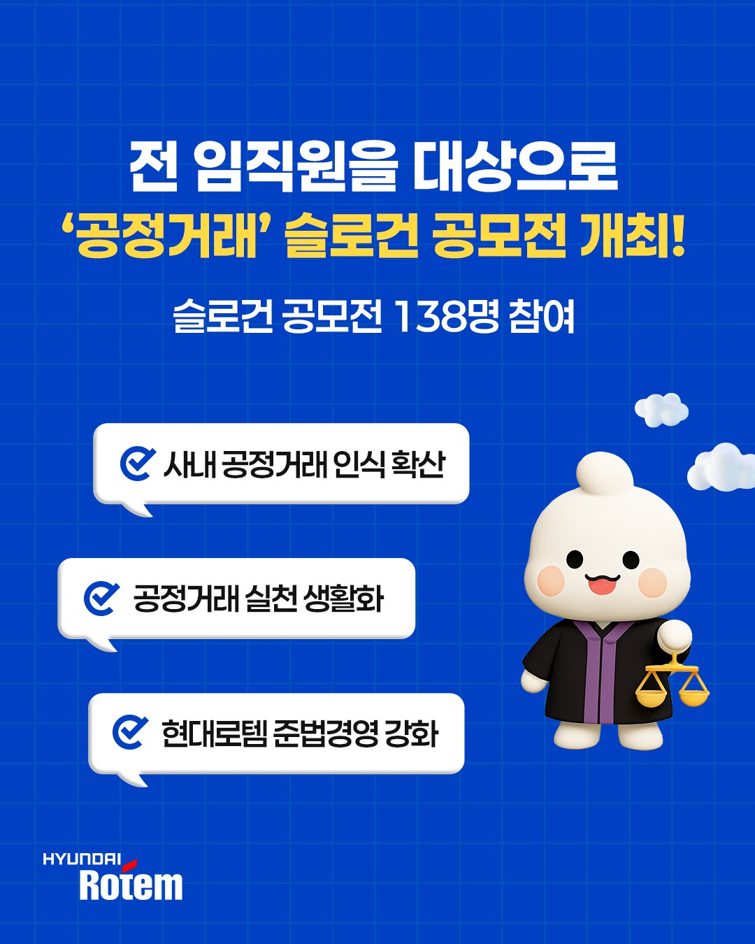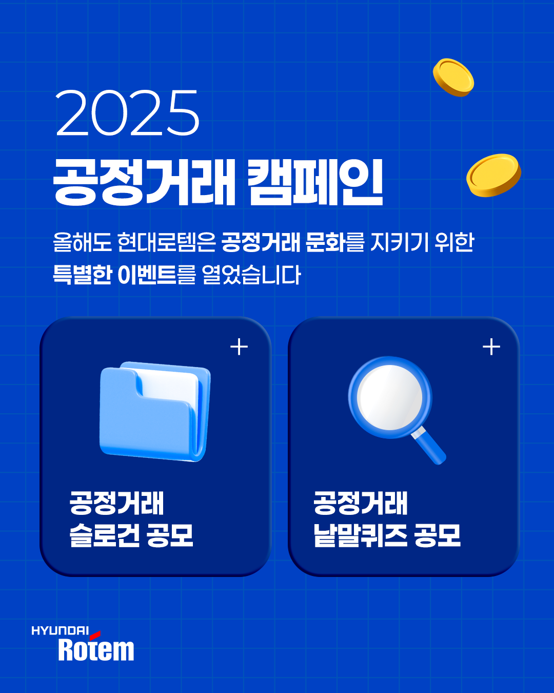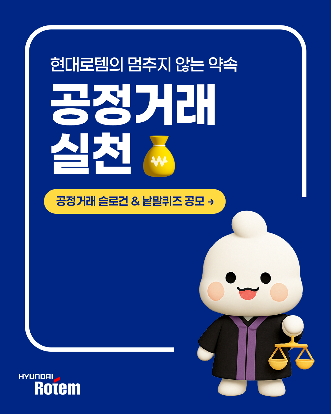 올해도 현대로템은 임직원들이 직접 참여하는 공정거래 캠페인을 열었습니다. 단순히 교육을 듣는 방식이 아니라, 누구나 즐겁게 참여할 수 있는 활동이 중심이었죠. 작은 참여가 모여 임직원들이 공정거래의 가치를 다시 한번 확인할 수 있었고, 이를 함께 실천해야 한다는 공감도 자연스럽게 형성되었습니다. 이번 캠페인은 단순한 이벤트가 아니라, 현대로템이 지켜가려는 문화와 가치를 임직원 스스로 체감하고 나누는 소중한 시간이 되었습니다.