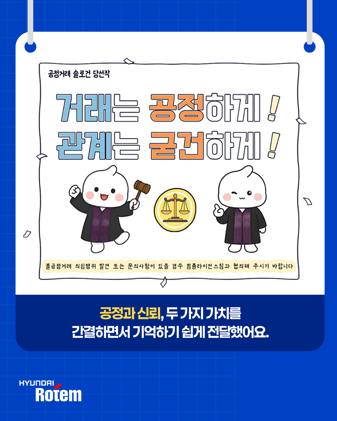 현대로템은 공정거래에 대한 사내 인식을 넓히고, 자율적인 실천 문화를 정착시키며, 더 나아가 대외적으로 신뢰받는 기업으로 자리매김하기 위해 계속 노력하겠습니다. 공정과 신뢰는 현대로템이 반드시 지켜야 할 약속입니다. 앞으로도 임직원 모두가 함께 참여하는 활동을 통해, 공정거래 문화를 바탕으로 더 투명하고 신뢰받는 현대로템으로 성장하겠습니다.