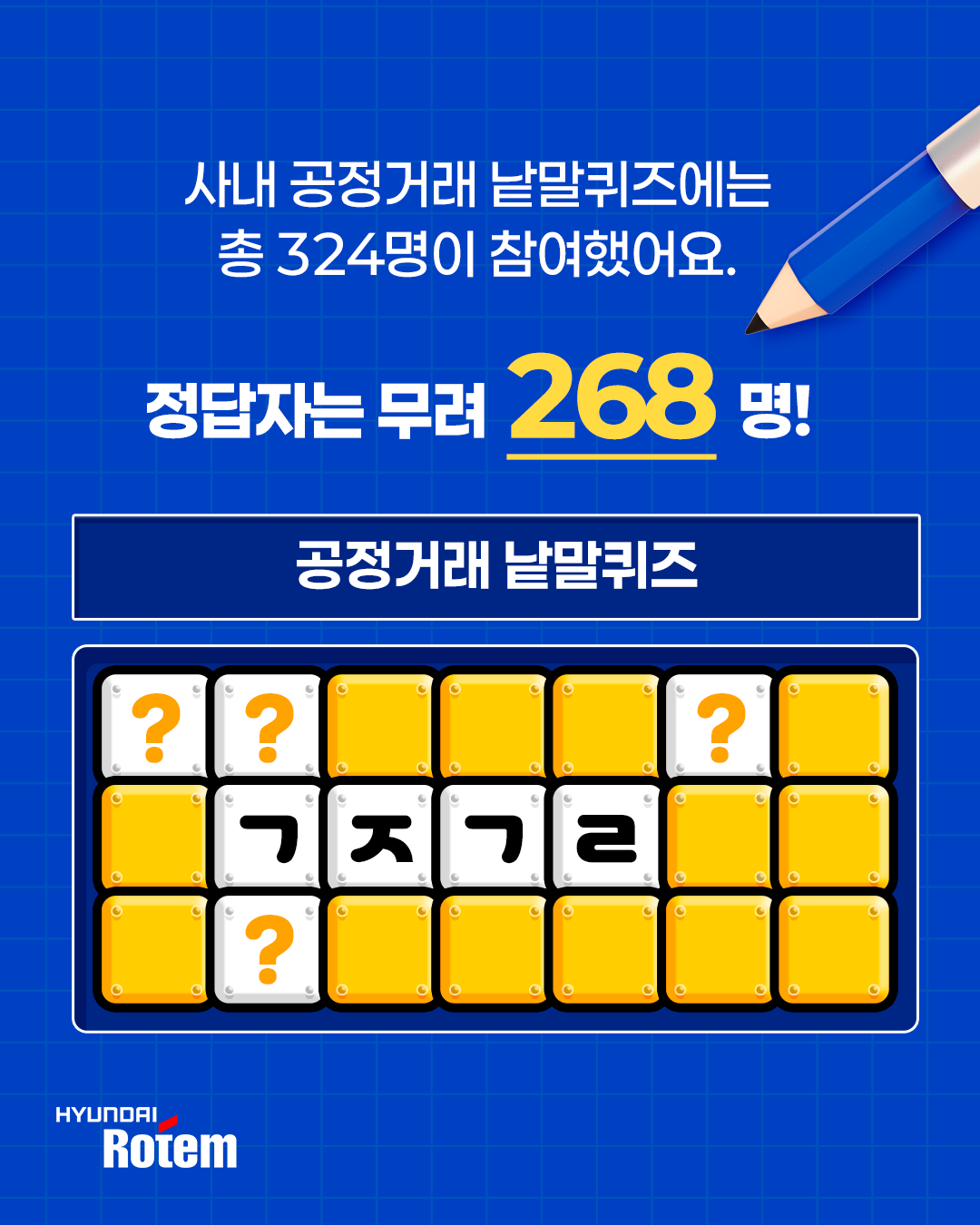 슬로건 공모전에 이어 열린 낱말퀴즈 이벤트에도 많은 임직원들이 참여했습니다. 총 324명이 도전했고, 그중 268명이 정답을 맞히며 높은 관심과 이해도를 보여주었습니다. 퀴즈를 풀며 자연스럽게 공정거래 개념을 되짚어볼 수 있었고, 작은 이벤트였지만 “공정거래는 어렵지 않고, 누구나 일상 속에서 실천할 수 있다”는 깨달음을 얻을 수 있었어요.