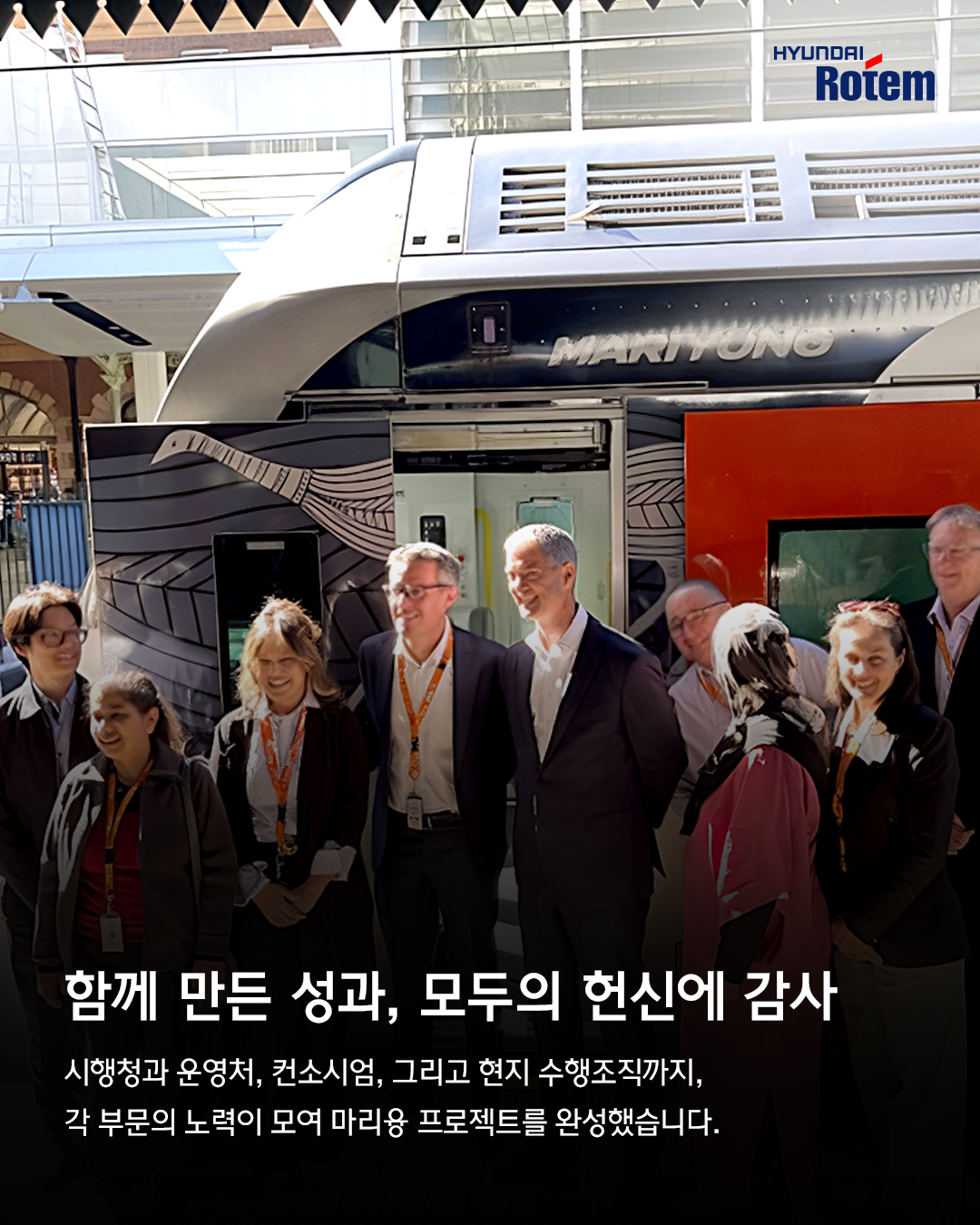 프로젝트의 완성 뒤에는 언제나 수많은 이들의 헌신이 있습니다. 시행청과 운영처, 컨소시엄, 그리고 현지 수행조직까지 각 부문의 노력이 한 방향으로 모여 마리융 프로젝트를 완성시켰습니다. 현대로템은 호주의 지역적 특성과 환경 조건을 면밀히 분석하며, 안전과 품질의 기준을 철저하게 관리했습니다. 이 과정에서 각 기관은 서로의 목표를 맞춰가며 신뢰를 쌓았고, 그 결과 기술적 완성도와 협업의 모범 사례로 평가받는 성과를 이뤄냈습니다.