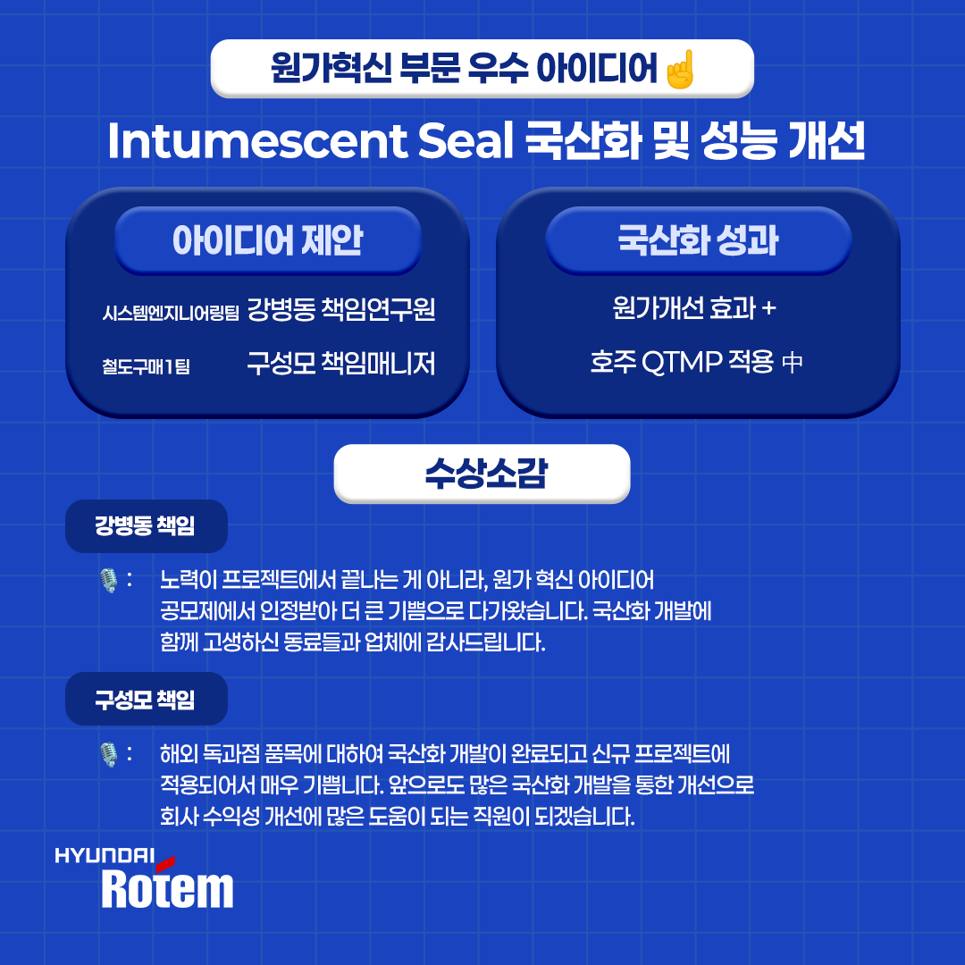 현대로템은 꾸준한 기술 혁신과 원가 경쟁력 강화를 위해 매년 다양한 개선 아이디어를 발굴하고 있는데요.