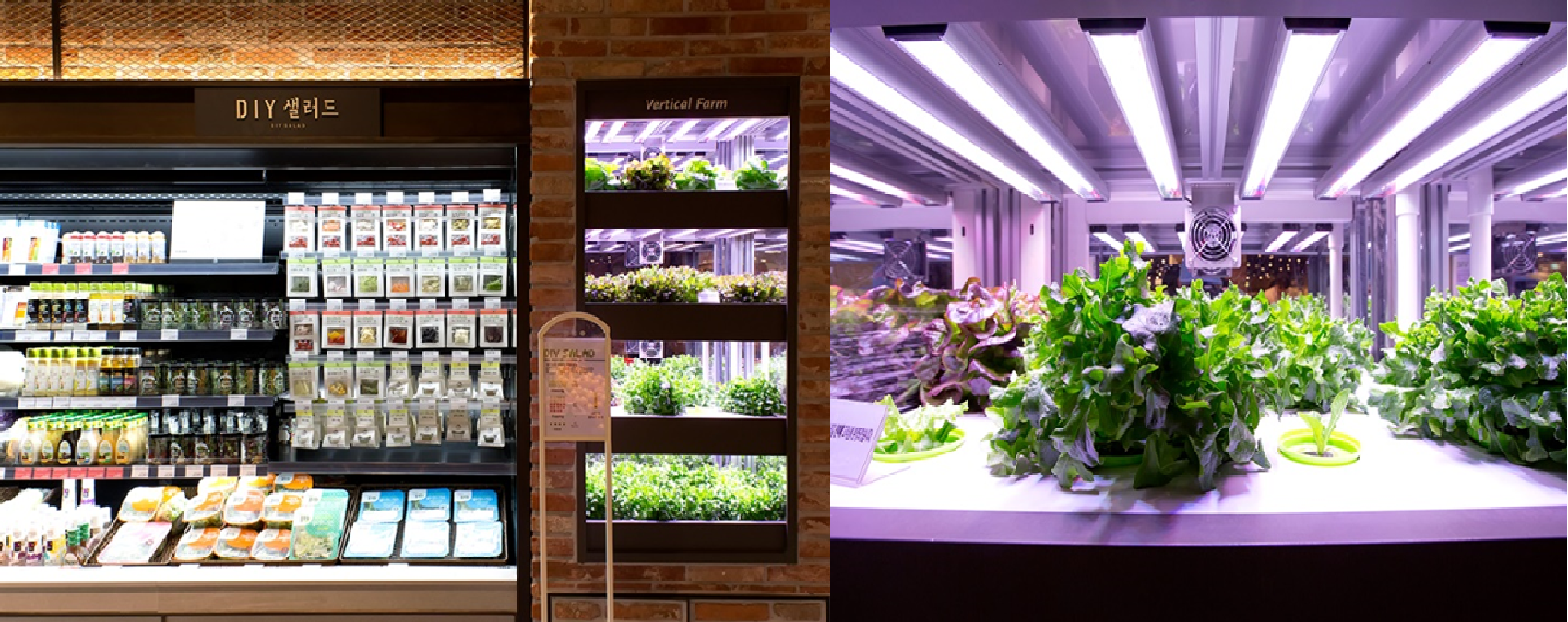 현대백화점 킨텍스점의 식품관의 DIY 샐러드 코너 옆에는 버티컬 팜이 설치되어 있습니다. 스마트팜 재배 시스템을 갖춘 수경재배 공간인데요. 소비자는 한자리마다 약 3,000원의 가격으로 사전 분양받아 약 2~30일 동안 해당 자리에서 자란 채소를 직접 따서 먹을 수 있습니다. 재배종은 상추, 치커리, 로메인 3종이 준비되어 있습니다. 또한 대전 현대아울렛에서도 버티컬 팜 코너를 만나볼 수 있는데, 이곳은 자리 분양시스템이 아닌 재배된 채소를 송이 단위로 판매합니다.