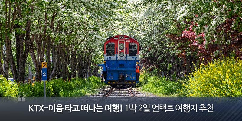 KTX-이음으로 더 편하고 빠르게 이동할 수 있게 되며 국내 당일치기 여행이나 1박 2일 여행을 계획하는 분들도 계실 텐데요. KTX-이음을 이용해보고 싶었던 분들이라면, 혹은 포스트 코로나 시대 안전한 여행을 떠나고 싶었던 분들이라면 오늘 현대로템 블로그에서 소개하는 여행지를 확인해 보세요!