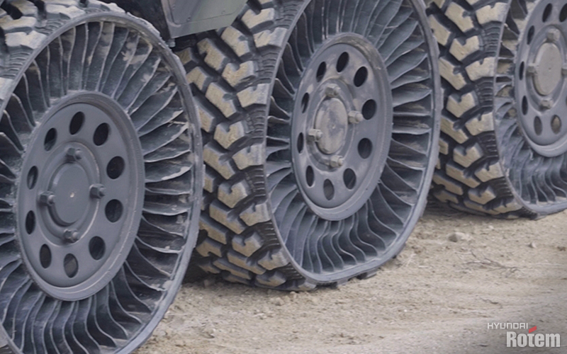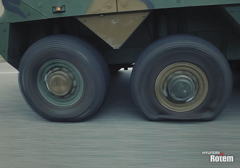현대로템 차륜형장갑차에는 런플랫 타이어(Run-flat Tire)가 사용됩니다. 하천과 산악지형이 많은 우리나라 지형에서 최적화된 성능을 발휘하기 위해 런플랫 타이어가 적용됐습니다. 보통의 타이어의 경우 내부에 기체를 주입해 타이어를 부풀리는데요. 타이어에 구멍이 나게 되면 기체가 구멍을 통해 빠져나가며 타이어의 형상이 무너지고 주행이 불가하게 됩니다.