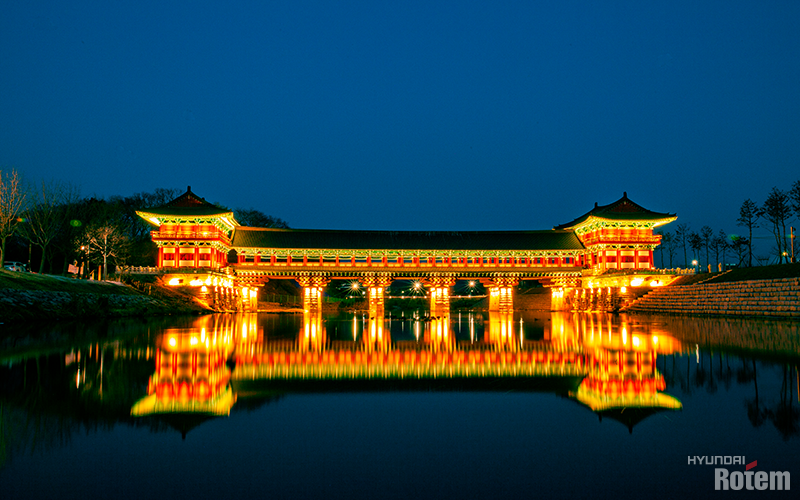 황리단길 인근에는 경주 대표 유적지이자 야경 명소로 유명한 곳들이 있습니다. 그중 월성과 신라의 불국토 남산 사이를 가르던 물길인 문천 위로 놓인 월정교와, 이어진 곳에 있는 동궁과 달이 비치는 연못이 합쳐진 이름의 동궁과 월지가 대표적인데요. 화려한 조명과 유려한 건축물이 물에 비치는 모습이 어떤 각도에서 보아도 아름다워 자연스레 카메라를 꺼내 들게 합니다.