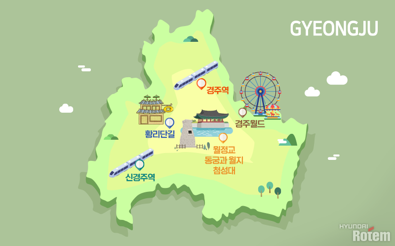 무궁무진한 고도의 매력과 현대의 ‘힙’을 함께 느낄 수 있는 경주는 현대로템의 무궁화호, KTX, SRT, ITX-새마을 차량을 이용해 중앙선의 종착지인 경주역과 경부선 신경주역으로 방문할 수 있습니다.