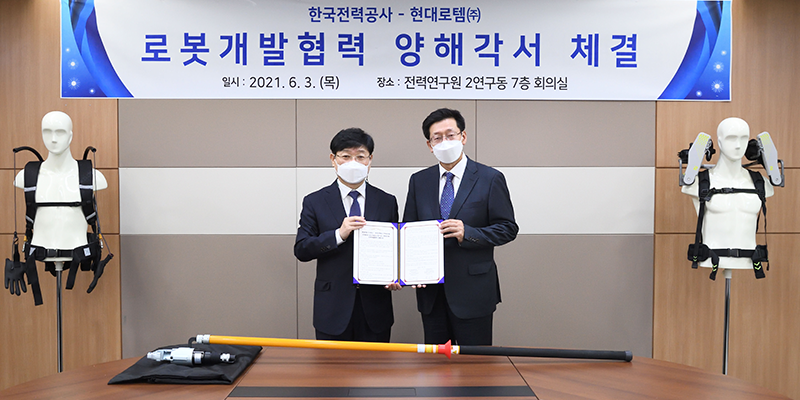 현대로템은 3일 대전에 위치한 한전 전력연구원에서 한전과 ‘전력분야 공사작업자 안전 및 근력보강용 로봇 개발’에 대한 업무협력 양해각서(MOU)를 체결했다고 4일 밝혔습니다.