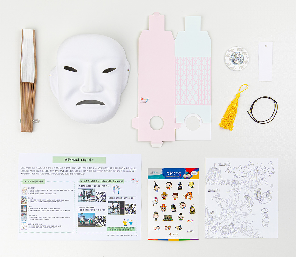 기존에는 강릉단오제 기간 중, 단오장에서만 즐길 수 있었던 체험재료를 올해부터는 온·오프라인으로 판매하여 전국 곳곳에서 언제든지 즐길 수 있게 되었습니다. 이는 단오체험의 한시성을 극복하는 수단이자 교육 자료로의 활용이 기대되는데요. 관노그림탈, 단오부채, 단오소원등, 컬러링엽서, 단오캐릭터 스티커를 기본 구성으로 하며 강릉단오제를 알리기 위한 책자도 함께 배포됩니다. 구성품은 단오제 기간중과 다른 날에 차이가 있을 수 있으니 미리 확인하고 구입하시기 바랍니다.