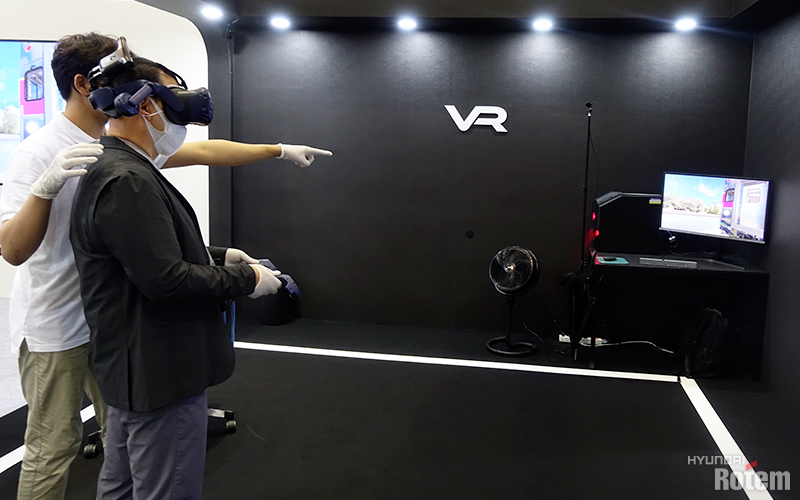 지난번에 이어 이번 전시회에도 설치된 VR 부스에도 많은 관람객들이 방문했습니다. VR 글래스를 쓰고 컨트롤러를 들면 마치 차량에 탄 것처럼 문을 열고 차량 밑을 본다거나, 차량을 운전하고 도장을 바꿔보는 등 다양한 경험을 할 수 있는데요. 이 시스템은 실제로 코로나19 시대에 글로벌 고객들에게 보내는 온라인 브로슈어로도 쓰이고 있다고 합니다. 코로나19 예방 수칙에 맞도록 관람객 수를 조정하고 글라스와 컨트롤러를 계속 소독하는 등 안전에도 신경 쓰는 모습이 믿음직스러웠습니다.