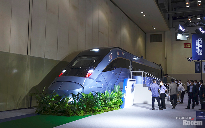 현대로템 부스의 맨 끝에는 지난 2021년 1월 4일 개통식을 가진 KTX-이음을 꼭 닮은 동력분산식 고속열차가 전시되어 있었습니다. KTX-이음과 동일 규격으로 제작된 이 차량은 국내 첫 시속 320km/h급의 동력분산식 고속열차의 실물인데요. 역간 거리가 짧은 한국 간선 철도 시스템에 맞도록 설계되었습니다.