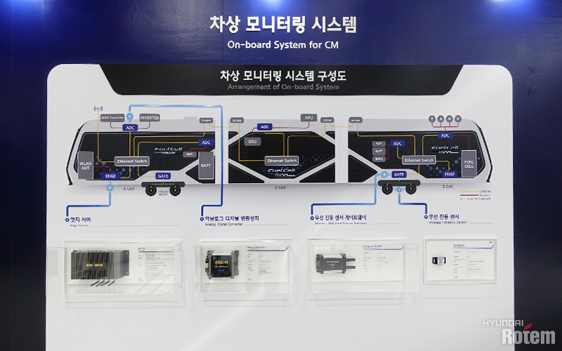 입구에서 KTX와 SRT에 투입된 현대로템의 고속열차 KTX-I과 KTX-산천, KTX-이음(EMU-260) 동력분산식 차량 모형을 보다 보면 자연스럽게 전시 속으로 빠져듭니다. 전시는 크게 여섯 가지 테마로 구분되어 있는데요. 첫 번째 테마는 4차 산업혁명 기술을 대표하는 IoT 기술의 무선센서, 클라우드 기반의 빅데이터 플랫폼, 그리고 디지털 트윈 기술을 접목한 수소 통합 관제 시스템을 통해 철도차량뿐만 아니라 시설물 모니터링을 통해 사용자의 효율적 운영과 최적의 유지보수를 지원하는 ‘디지털 서비스’ 존입니다.