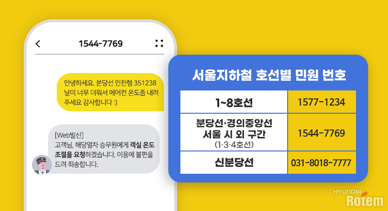 자동 센서에 의해 적정온도를 유지한다고 하지만, 지하철을 이용하는 승객들은 외부의 날씨와 습도, 객차 내의 혼잡도 등에 따라 더 강한 냉방 혹은 약한 바람을 원할 수 있죠. 이는 ‘또타지하철’ 앱이나 문자로 탑승 차량의 칸 번호와 함께 요청사항을 접수할 수 있습니다. 하지만 과도한 민원 접수와 자신의 의견이 반영되지 않은 사후처리에 대한 불만의 목소리가 나오기도 하는데요. 많은 사람이 함께 이용하는 공간인 만큼 미리 객차 내의 냉방장치 위치를 고려해 이용하거나 얇은 옷가지를 준비하는 등의 배려가 따른다면 보다 많은 사람들이 편리하고 쾌적하게 지하철을 이용할 수 있을 것입니다.