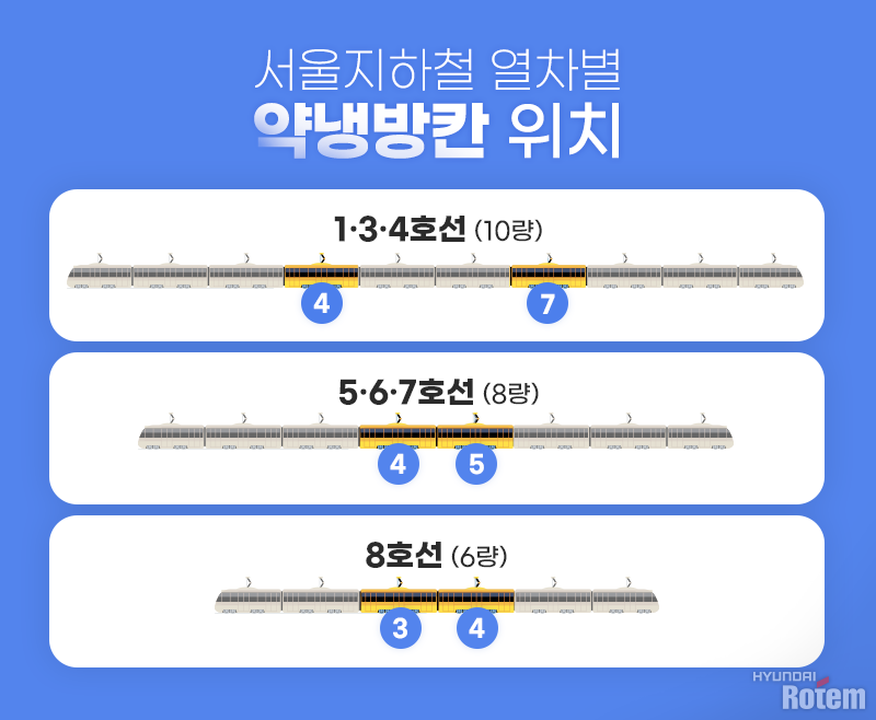 그리고 서울지하철 기준으로 2, 9호선을 제외한 1~4호선, 5~8호선에는 냉방 설정온도 자체를 일반 객실보다 대략 섭씨 1~2도 정도 높게 설정한 약냉방칸이 있습니다. 그 위치는 10량의 1, 3, 4호선은 4, 7번째 칸, 8량의 5, 6, 7호선은 4, 5번째 칸, 8호선은 3, 4번째 칸으로 대부분 중앙 차량에 몰려 있습니다. 살에 닿는 차가운 에어컨 바람에 괴로우신 분들은 약냉방칸 이용을 추천드립니다.