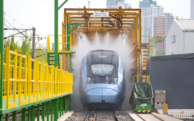 현대로템은 철도차량 납품에 있어서 제품의 고품질 확보를 위해 다양한 성능시험을 진행합니다. 그 중 반드시 거쳐야 하는 과정으로 누수 시험이 있는데요. 국내 철도나 지하철에 투입되는 현대로템의 완성차는 기본적으로 1bar 이상의 압력으로 엄청난 양의 물을 분사하는 누수 시험을 시행합니다. 이 시험은 최초 형식시험 편성 1시간, 양산 편성은 30분간 이뤄지는데요. 이 같은 강력한 누수 시험에도 완성차에 수분이 유입되지 않도록 설계부터 승강문 부분의 이중 구조 제작 및 창문 테두리까지 섬세한 특수 설계를 적용합니다.