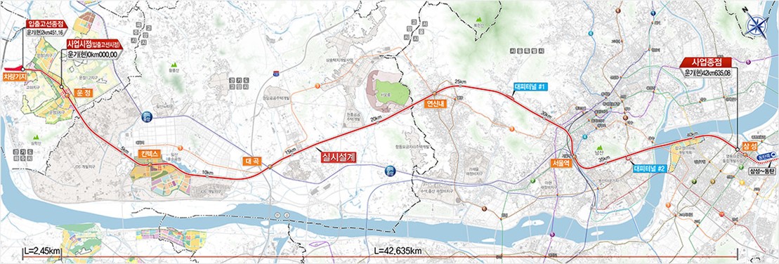 GTX-A의 구간은 파주 운정에서 서울 삼성까지 42.6km를 건설하고 동탄까지 37.4km 연장하여 총 80km 구간에 10개 역을 운행할 계획입니다. 긴 구간이지만 정차역을 줄여 주요 거점까지의 표정속도를 높이는 것에 집중했습니다. 또한, 지도상에서도 느껴지듯이 노선을 직선화하여 차량의 빠른 운행을 돕는 환경을 구축했는데요. 최고운행속도 180km/h, 설계 최고속도는 198km/h를 자랑하는 GTX-A는 기존의 수도권 지하철의 최고운행속도 100km/h(평균운행속도는 30~40km/h)와 비교하면 두 배 가까이 빠른 속도이며, 200km/h 이상이 기준인 고속철도에 가까운 준고속형 열차입니다.