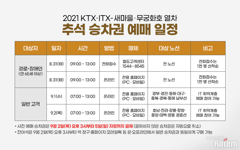 뜨거웠던 여름이 지나고 더위를 식혀줄 가을 장맛비가 내리고 있습니다. 가을에는 민속 최대 명절, 추석이 있는데요. 작년에 이어 올해도 코로나19로 마음 편히 고향에 내려가기 어려운 상황입니다. 하지만, 백신 접종이 활발히 진행되면서 이번 추석은 고향에 방문하는 분들 많으실 텐데요. 매 명절마다 우리의 든든한 이동 수단이 되어주는 기차! 올해 추석에는 어떻게 승차권을 예매할 수 있을까요? 2021 추석 승차권 예매 방법 TIP을 현대로템에서 알려드립니다!