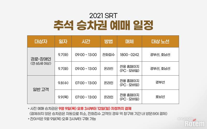 - 만 65세 이상 고객 중 SR 회원이라면 사전 접수 없이 9월 7일 예매 가능
