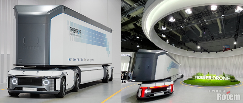 부스 중앙에는 거대한 트레일러가 자리하고 있었는데요. 이것은 ‘트레일러 드론’이라 부르는 미래형 운송 시스템입니다. 기본적으로 장거리 물류 이동을 기반으로 한 무인 자율주행 수소 연료전지 트레일러로, 전후에 2대를 배치해 회전 반경을 다양화하는 등 다양한 기동이 가능하죠. 좁은 로터리를 자연스럽게 회전하는 트레일러 드론의 기동 능력은 많은 참관객의 감탄을 자아냈습니다.