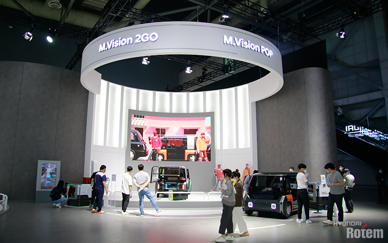 현대자동차그룹은 새로운 수소 사회의 물결을 표현하기 위해 총 4,872㎡의 대규모 부스를 구성했는데요. 입구 왼쪽에는 근거리 배달용 수소모빌리티 ‘엠비전2GO’와 도심형 초소형 전기 모빌리티 ‘엠비전POP’이 전시되어 있었습니다.