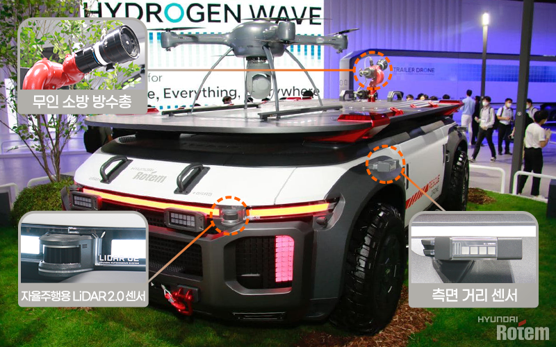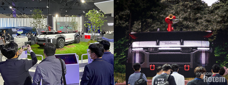 맞은편에는 현대로템의 ‘레스큐 드론’이 전시되었습니다. 트레일러 드론과 마찬가지로 레스큐 드론의 ‘드론’은 비행체가 아닙니다. 드론은 무인으로 기동하는 비행체와 모빌리티, 선박 등 모든 이동 수단을 의미하는데요. 레스큐 드론은 이름 그대로 화재 진압이나 인명 구조 등 감시와 정찰 목적으로 개발된 무인 차량입니다.
