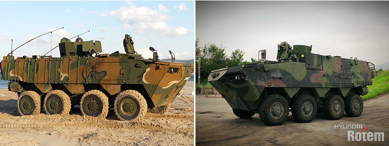 현대로템은 현대자동차그룹의 자동차 기술과 현대로템이 보유한 최신 전차 기술을 접목해 국내 기술로 보병부대의 발을 담당할 차륜형장갑차를 개발하기도 했습니다. 현대로템의 차륜형장갑차는 6x6의 K806, 8x8의 K808 두 모델로 나뉘며 K808은 수상추진장치, 런플랫 타이어, 공기압자동조절장치 등이 적용돼 K806 대비 야지 운용 성능이 보다 우수합니다.
